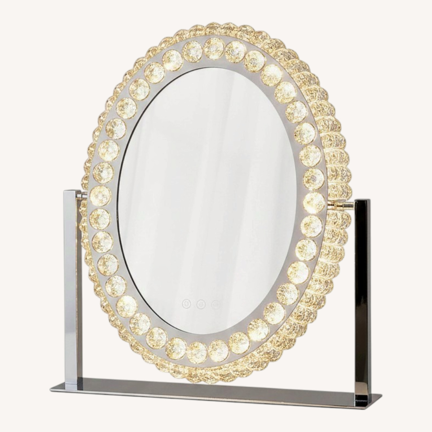 Seller's Notes:This LED mirror oval crystal makeup mirror adopts light luxury modern style, precise cutting technology, simple and exquisite, a fashionable creative inspiration, and all exudes unique and charming light charm.
