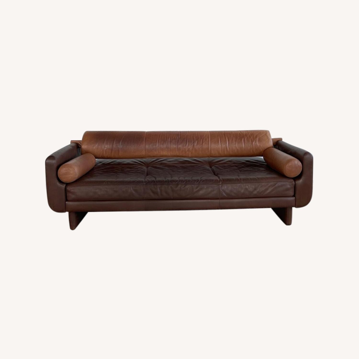 Seller's Notes:Classic sofa designed by Vladimir Kagan for American Leather Studios. The removal of the back bolster converts the sofa into a daybed. The lines are clean, minimal, and versatile. In excellent vintage condition with some natural patina to the leather.
