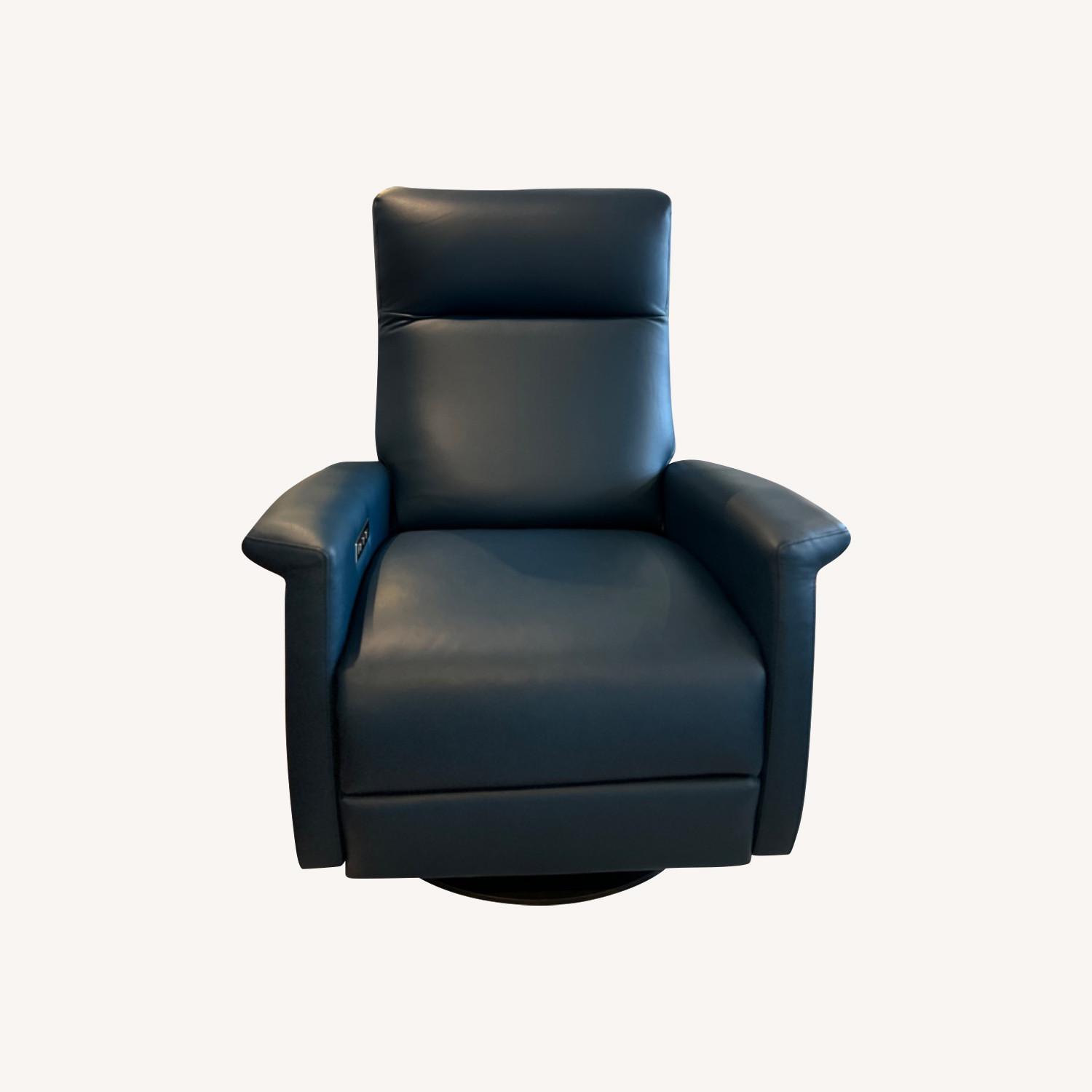 Seller's Notes:A beautiful pair of modern swivel recliners purchased in January 2023 and still in mint condition. American Leather brand Fallon style in a rich peacock blue genuine leather with a gray ash base. The chairs power recline through electric cord or a rechargeable battery option for no-show cords. Independently controlled back and footrest for unlimited relaxation. Crafted in USA.