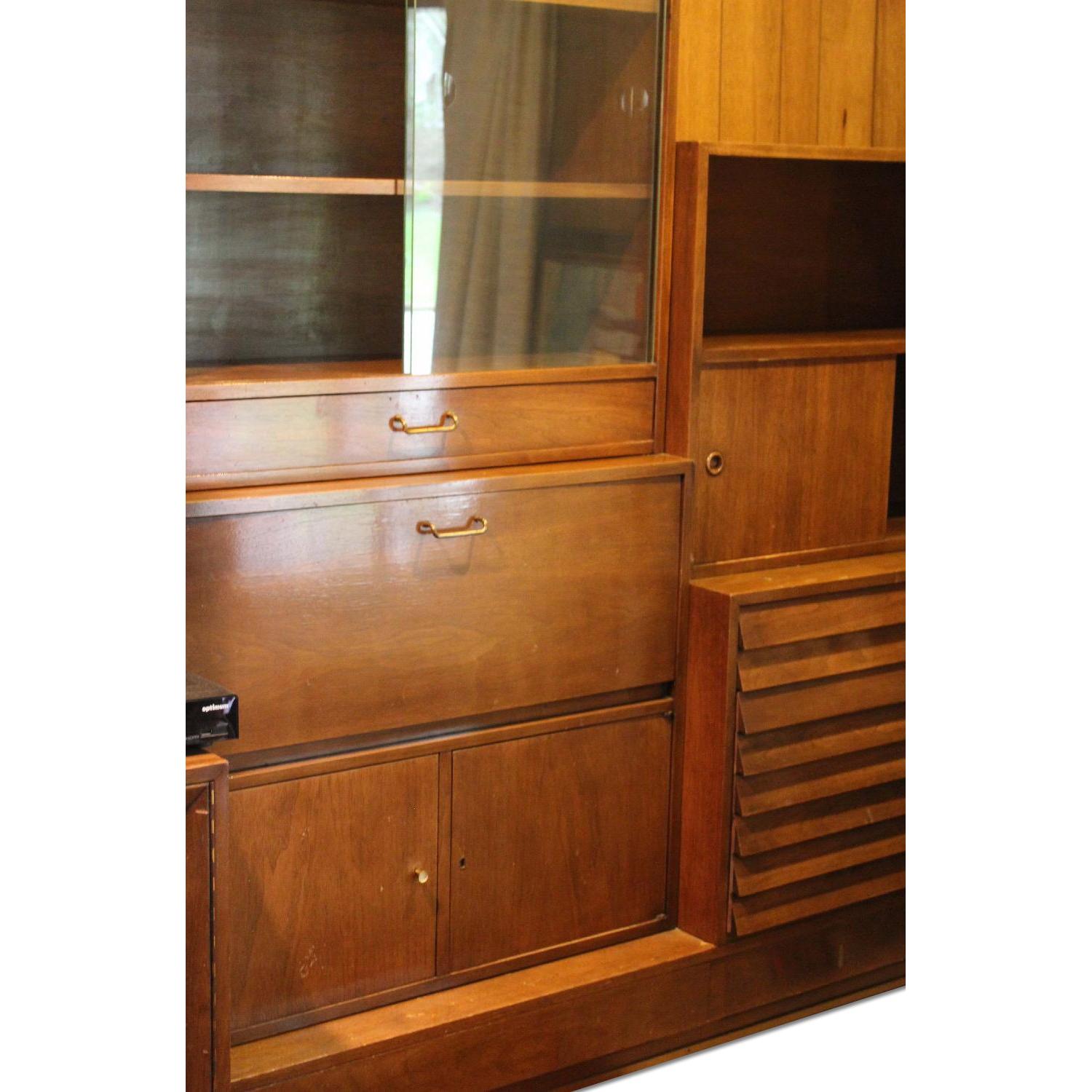 Seller's Notes:This is a beautiful mid-century modern American of Martinsville set, I think by designer Merton Gershun. It has more pieces than many I've seen online - the manufacturer is well-known and these are in demand. It is in very good though not perfect condition, with some minor scratches and discoloration, and a missing key to the dedicated bar. Note that the second picture does not show off the warm color of the wood, better seen in the first picture. The drop-down bar has slots for glasses. The pieces include a sliding door cabinet, drawers with one lined for silverware, a locking (with the missing key!) bar cabinet, and display case, and open shelves. There's plenty of storage. Really a nice find, and you can perhaps find other items of the same vintage and type online. Check out Martin Gershun's Dania collection, with potential matching pieces.