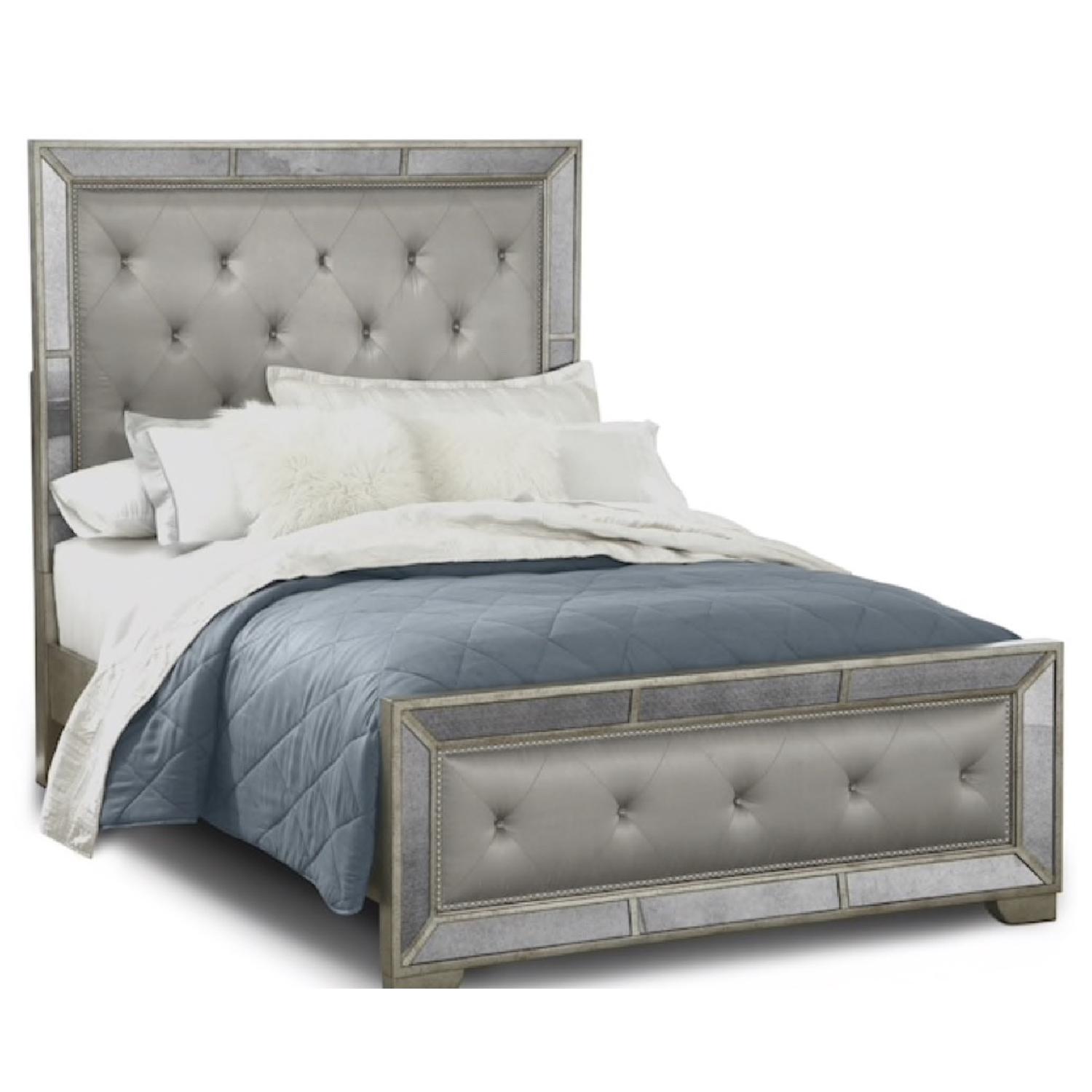 Seller's Notes:Lavish Life. Showcase your love for the finer things with the uniquely styled Angelina Queen bed. Sheer elegance is on display from head to toe with antiqued, mirrored accents, a textured, silver flake finish and jeweled buttons, while brushed nickel nailhead trim offers a more contemporary touch. Deeply tufted silver- and gold-toned fabric with a glamourous sheen creates a truly dramatic effect. This generously sized piece with canted bracket feet in a matching finish exudes pure opulence. So indulge your inner diva by coming home to the sophisticated and luxurious Angelina Queen bed. Condition: Upholstery on tufted foot board needs a cleaning. Please see photos. One of the bottom slats needs a new screw. Wood hole has widened and it doesn't screw all the way down. This does not effect the sturdiness of the bed. I have slept on it like this for years. Dimensions: Width: 64'' Height: 68'' Depth: 90''