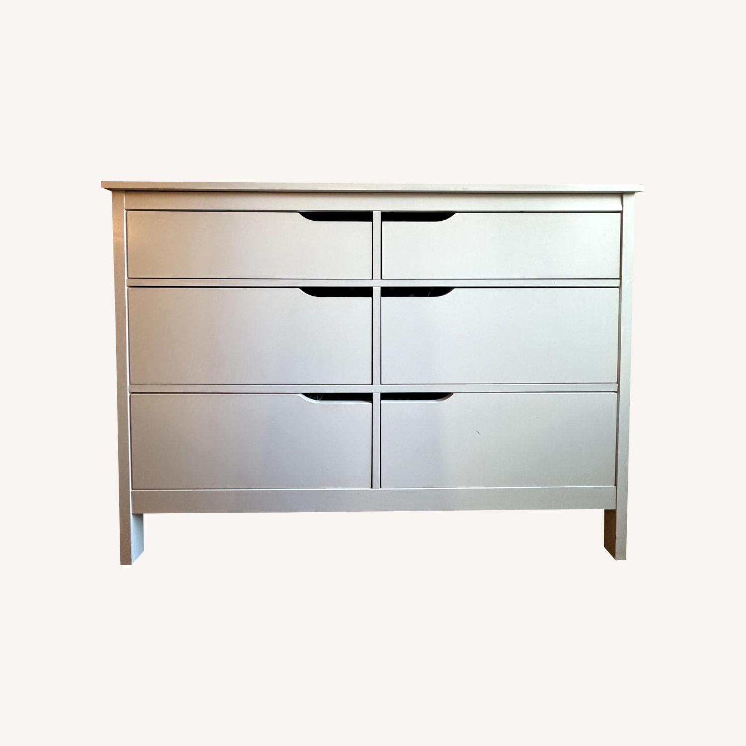 Seller's Notes:This gorgeous white dresser has served us well and we are sad to be parting with it because we are moving. The six drawers provide ample storage space for a couple. The sleek flush design with no exposed pulls will look great in nearly any apartment!