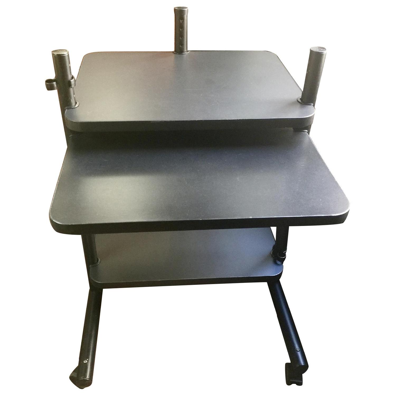 Seller's Notes:ERGONOMIC ROLLING DESK OR TABLE Anthro Carts are versatile and strong mobile tables or desks, used in offices, schools, hospitals, video production facilities, labs, and clinics. HISTORY AnthroCarts were made by Anthro Corp, maker of Anthro Technology Furniture Ⓡ, anthro.com. Ergotron acquired Anthro Corp. The 24”AnthroCart (PCO3BK), sold here, was the most popular Cart made by Anthro since its inception in Oregon in 1984. It will be increasingly difficult to find this Cart since Ergotron discontinued making it in January 2019. USAGE It can be used as a computer workstation. Its standard two shelves allow for an iMac or a Pc and keyboard beneath. The additional lower shelf accommodates a printer. Or the unit can be used as a printer or multiple equipment stand with shelf storage space below. COMPOSITION This ergonomically designed black cart is 24” W, 35” H, 30” D and includes: The standard 24” Anthrocart with two shelves, three legs, and four locking casters and guide inserts. Included are: An additional small shelf of 24” W and 18” D, Two deep cup holders, Two gooseneck document holders, and Cable managers. ADVANTAGES In addition to being sleek looking, advantages include: the thick powder coated finish on steel parts is tough and durable resining chips and scratches. The castors roll easily on any surface. It is rated to support of 150 pounds so accommodates heavy objects. It can be quickly disassembled for easy transport and narrow door openings and easily reassembled. Full assembly documentation is included. OTHER This Anthrocart has the original invoice, product brochure, Assembly Instructions, tools, and an additional set of castors.