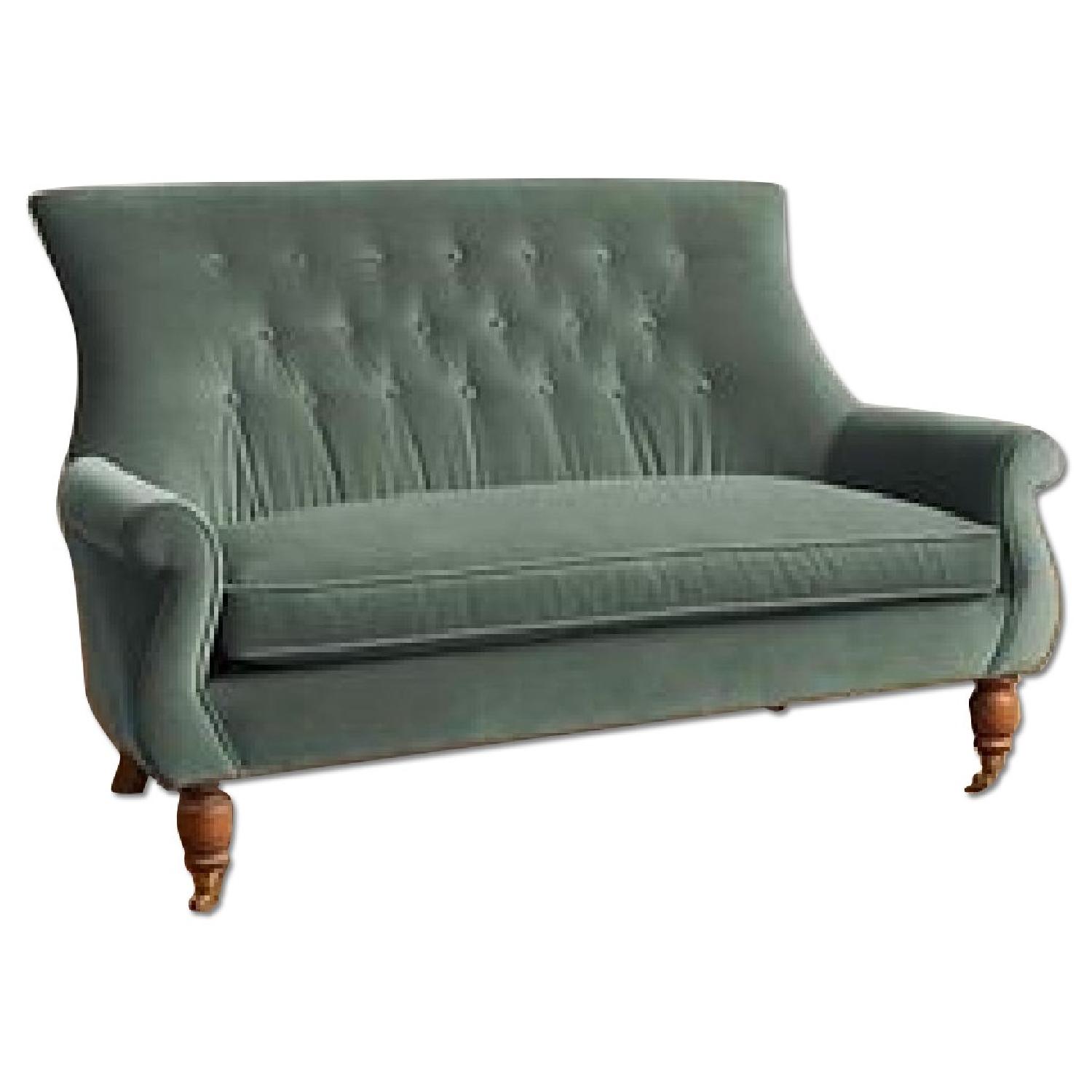 Seller's Notes:For sale is a gently used Astrid Settee from Anthropologie in Caribbean, a dark teal slub velvet. The sofa was purchased last fall and is in great condition, as it was used regularly for about 5 months before being relegated to my bedroom. It is super soft and the slub velvet fabric is easy to clean. There are two small areas of wear from my kitten that are not too noticeable as they're towards the bottom of the sofa (please see pics). No bedbug/smoking issues. It's currently listed on Anthro $1,798 (+ tax and $150 shipping). It's light and easy to move because of it's petite size.
