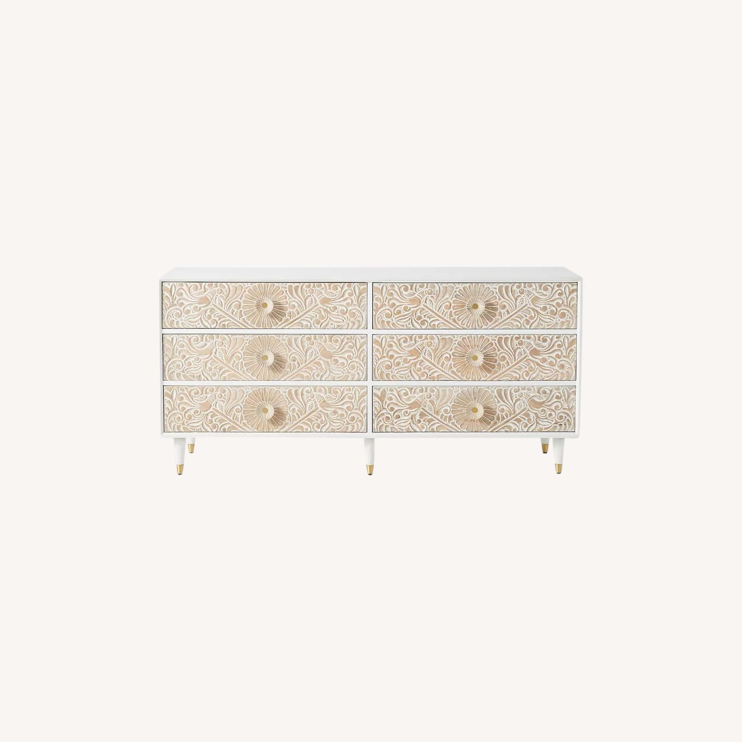 Seller's Notes:Beautifully carved Anthropologie 6-drawer Gulliver dresser. This item is made of solid hardwood with capped brass legs and is nearly new.