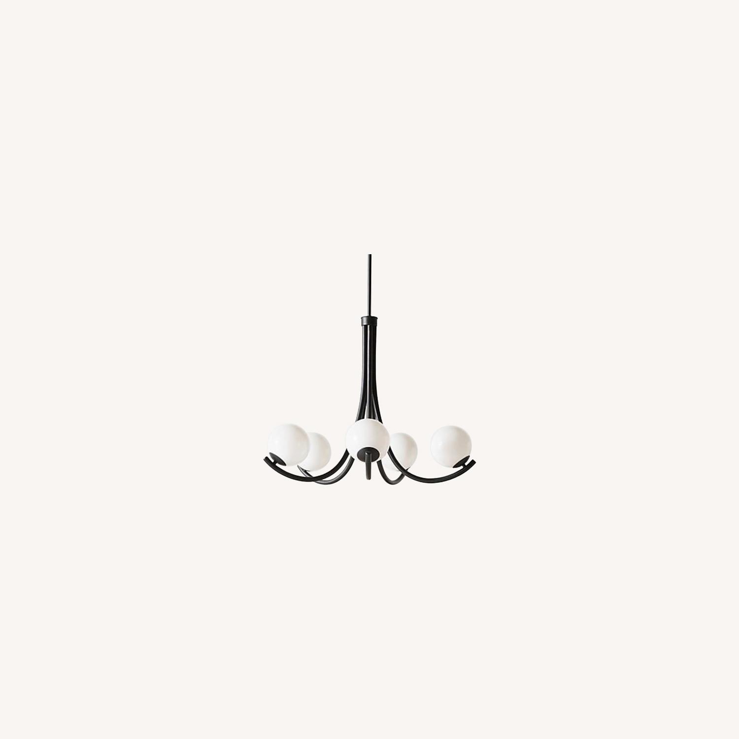 Seller's Notes:LIKE NEW CONDITION - Modern Black metal Parker Chandelier from Anthropologie. Height adjustable (Comes with extra rod). Purchased 2020. Bulbs not included.