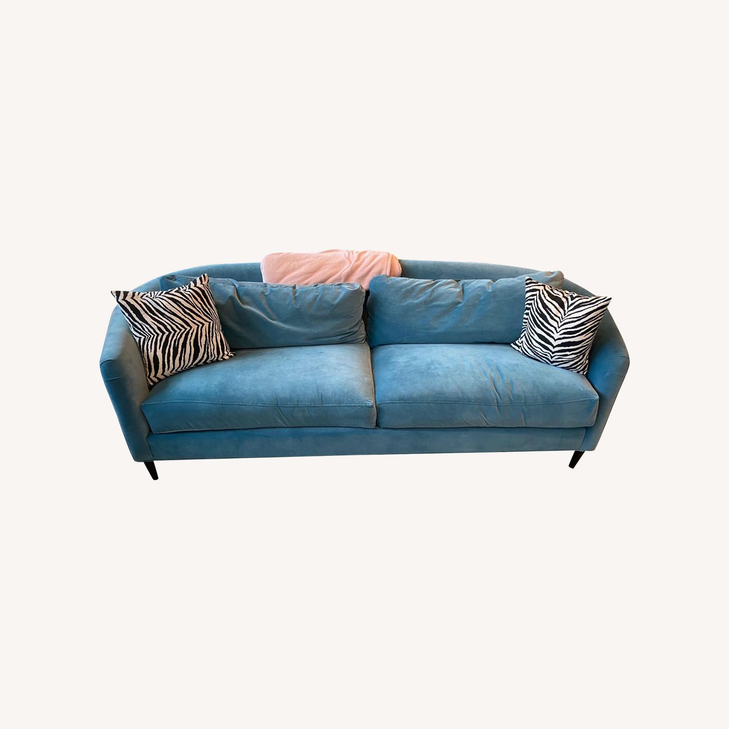 Seller's Notes:Velvet sofa. Seats 3 people. Comfortable curved arms. Dark wood legs. Light blue velvet fabric. Some grey discoloration on seat; may come out with professional cleaning. Otherwise in great condition and very comfortable. Selling because we're redecorating.