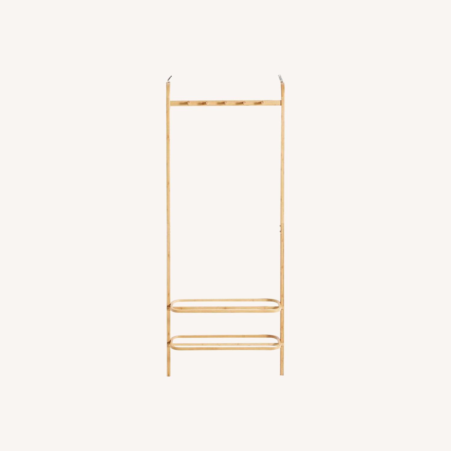 Seller's Notes:Discontinued Anthropologie Alba garment/entrance rack, bamboo, beautiful. 63"H, 25.5"W, 14.5"D. Unopened in original box. Retailed for $118