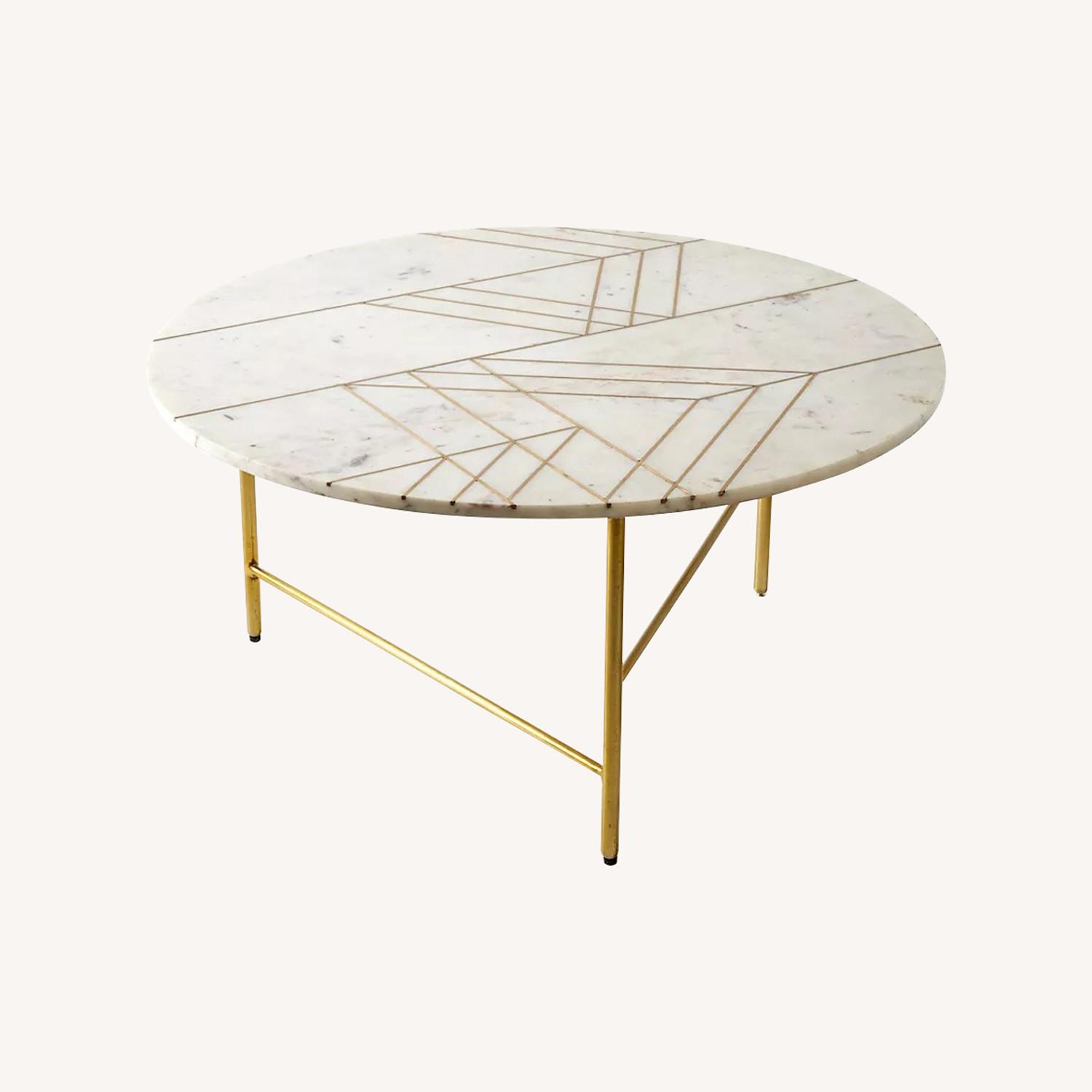 Seller's Notes:I am selling this Anthropologie marble coffee table because I recently moved to a new place and this beauty doesn't fit my space. It has lived in a home free of smoke and pets. It only has one minor blemish most people most notice (please check the photo with the red circle). Here are a few more details about this item: This marble coffee table is adorned with contemporary brass accents for a truly luxe piece. Engineered hardwood with marble; polished finish Brass frame and accents; antiqued finish Table is sealed with clear lacquer for easy cleaning; it protects against moisture, but should be maintained Dust with a soft, dry, clean cloth Wipe gently with a dry paper towel; dry immediately If liquid spills occur, prompt cleaning is advised Avoid using chemical cleaners Levelers included No assembly required Dimensions 17"H, 35" diameter 25" between legs Top thickness: 0.5" 4" under table clearance