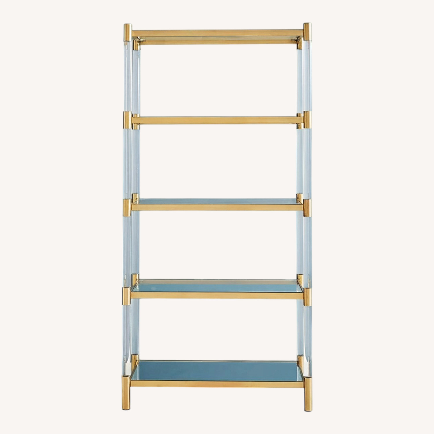 Seller's Notes:Lucite bookshelf with polished brass-plated stainless steel accents!