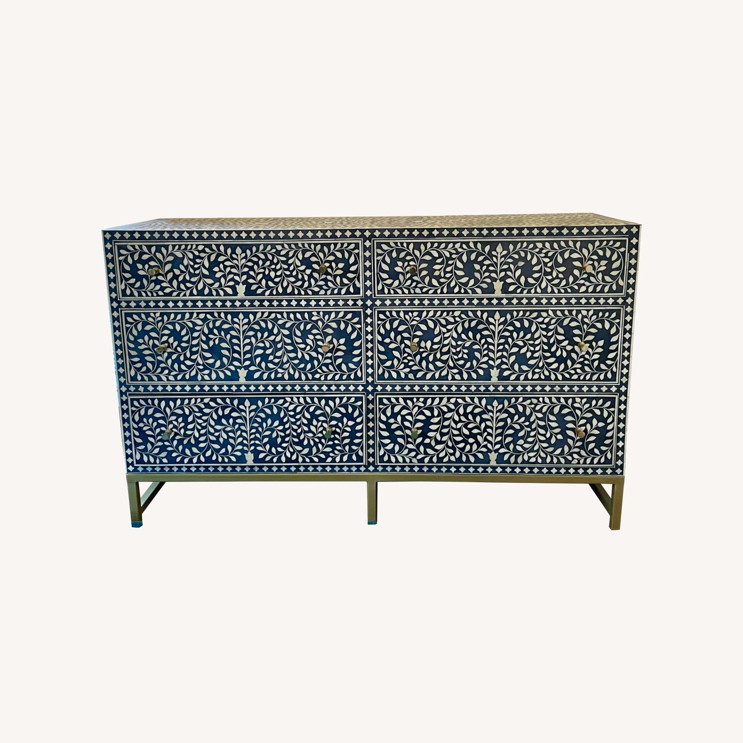 Seller's Notes:Perched atop the thin brass frame of this contemporary piece, lush, delicate foliage spirals and curves along a streamlined silhouette. Handcrafted dresser with white bone inlay and brass hardware Six roomy drawers for storage Less than 1 year old. Sold out navy color.