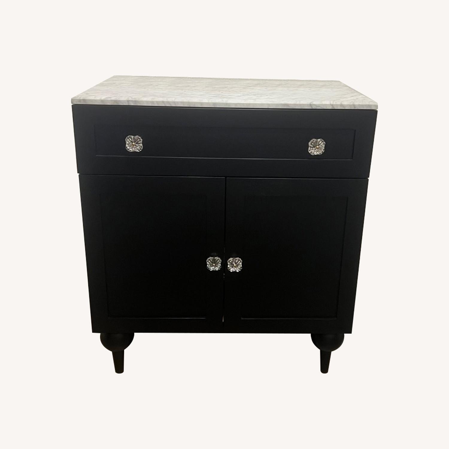 Ash wood cabinet in black & sage featuring brass hardware pulls and a white Carrara marble tabletop