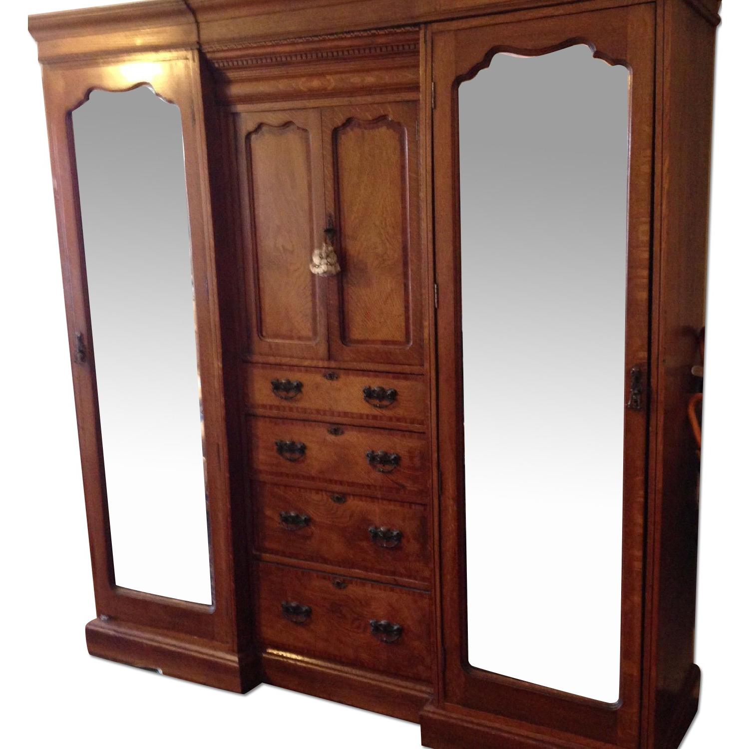 Seller's Notes:C. 1900s Edwardian Oak Triple Wardrobe Mirrored Two sections with hanging room (oak shelves have been added to both sections). Drawers in the middle section. Both closet sections have mirrors. Comes apart so will be easy to move.