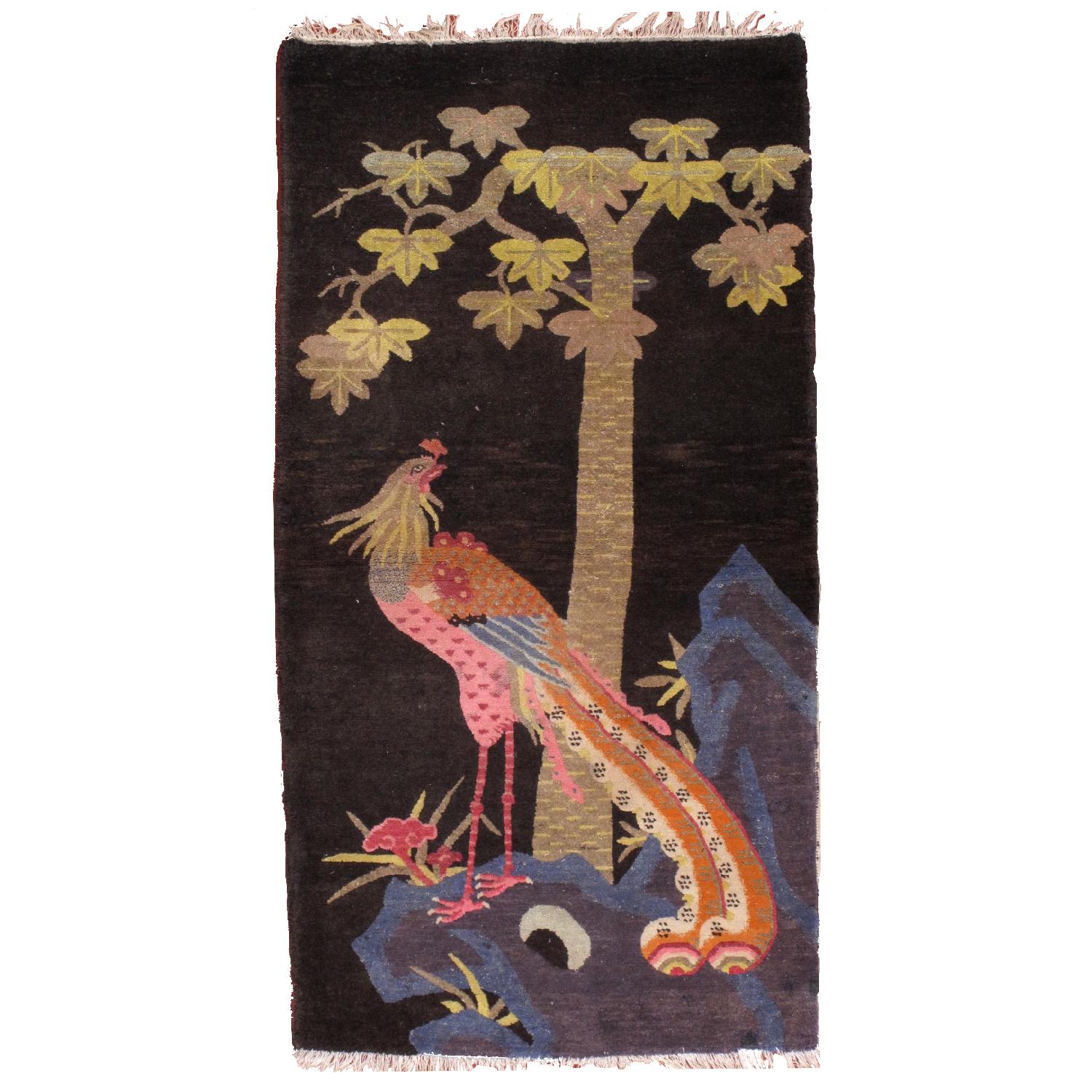 Seller's Notes:Very rare antique Art Deco Chinese rug in black shades. The rug is unusual by its design. The colorful peacock is resting on the blue rocks under olive tree. And all this composition made on black background. Nice color combination. The rug is in original good condition.