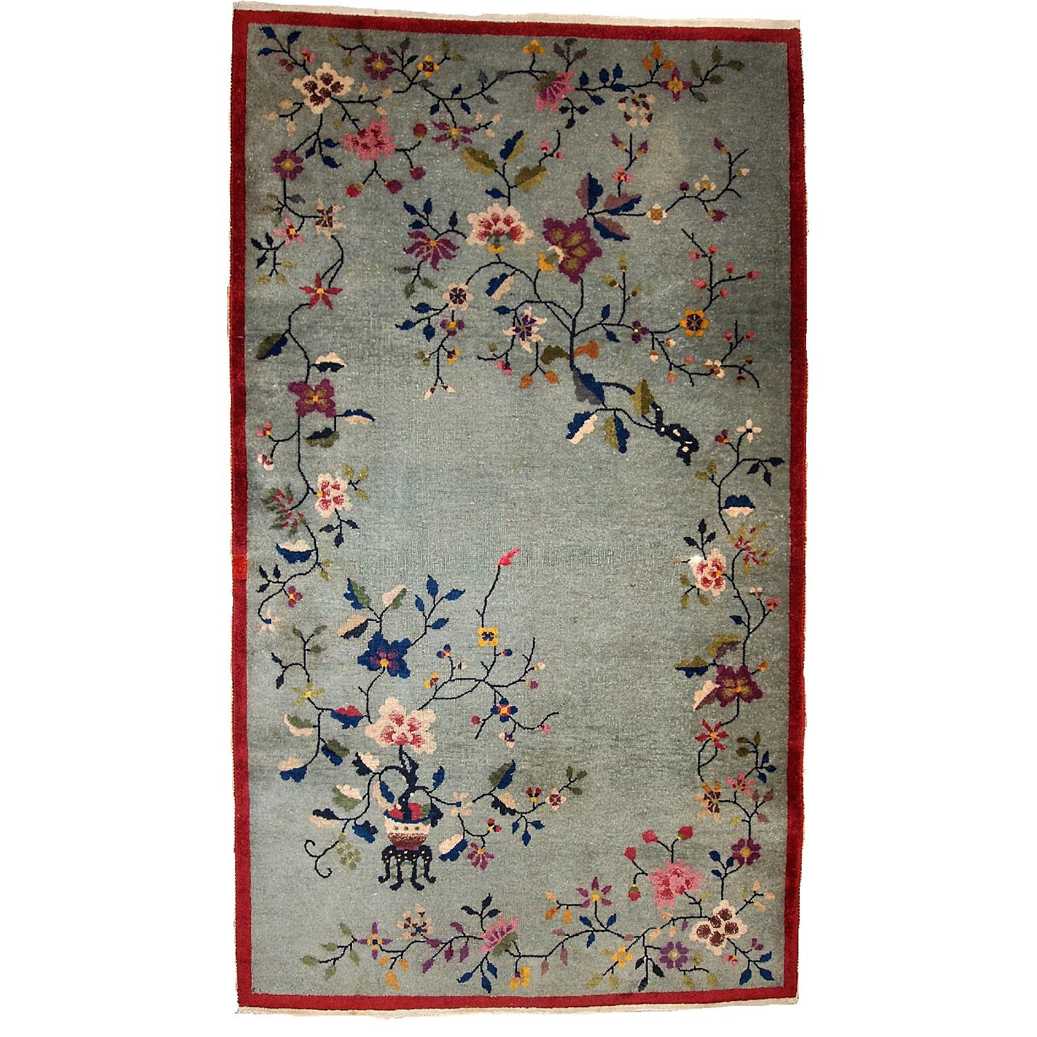 Seller's Notes:Decorative Art Deco Chinese rug in azure color of the sea. The rug is beautifully decorated in floral design. Many thin branches full of flowers are growing from the vase and covering the rug. It is another interpretation of famous design -The tree of life.