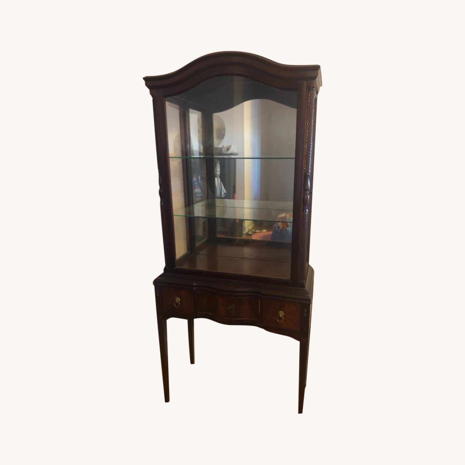 Seller's Notes:This elegant china cabinet was a family heirloom and is in very good condition with some minor marks on top of the cabinet, on one of the drawers, and on the base, all pictured here. The cabinet has attractive flame figuring to the drawer fronts that is typical of Honduras mahogany. The arched cornice is above the glass inset to the front and has conforming lateral doors enclosing glass shelves and a mirror back. The lower section has a serpentine fronted frieze comprising three drawers, the tapered square legs are inlaid with satinwood stringing and with bell flowers to the surmount.