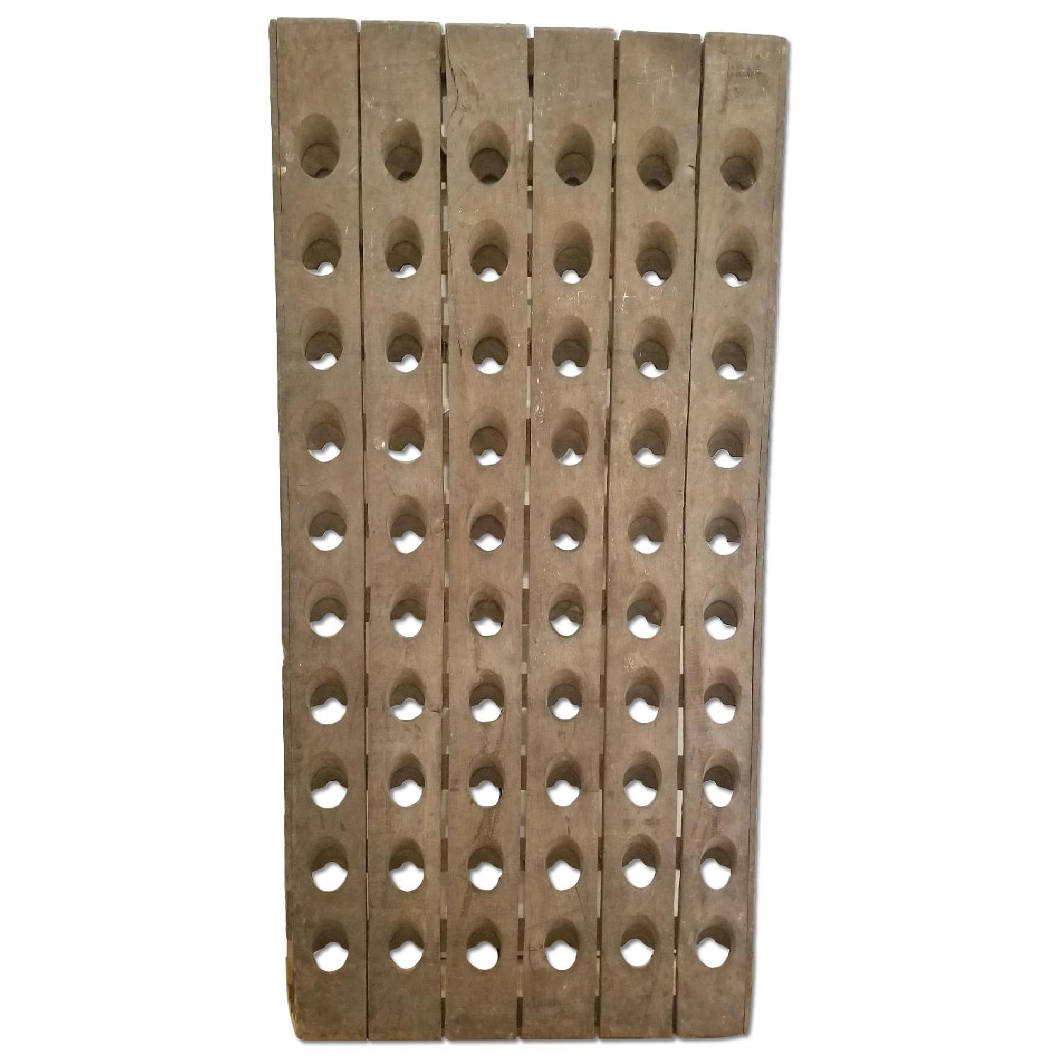 Seller's Notes:Antique Vintage Wood Champagne Riddling Rack / Wine Rack (one side only). This Antique Vintage Riddling Rack (one side, not two side hinged) and is a great conversation piece to display, and even better if you love champagne. I bought this in San Francisco several years ago from a store called The Butler and the Chef, known for authentic products and imports from France. It is antique and does show wear on the sides, see the pictures, giving it further character. On the top right side is carved P Filaine La Villa D'ay, 1964. This is genuine and very rare, whereas most racks today are manufactured by chain stores, and older products labeled antiques are actually manufactured in China.