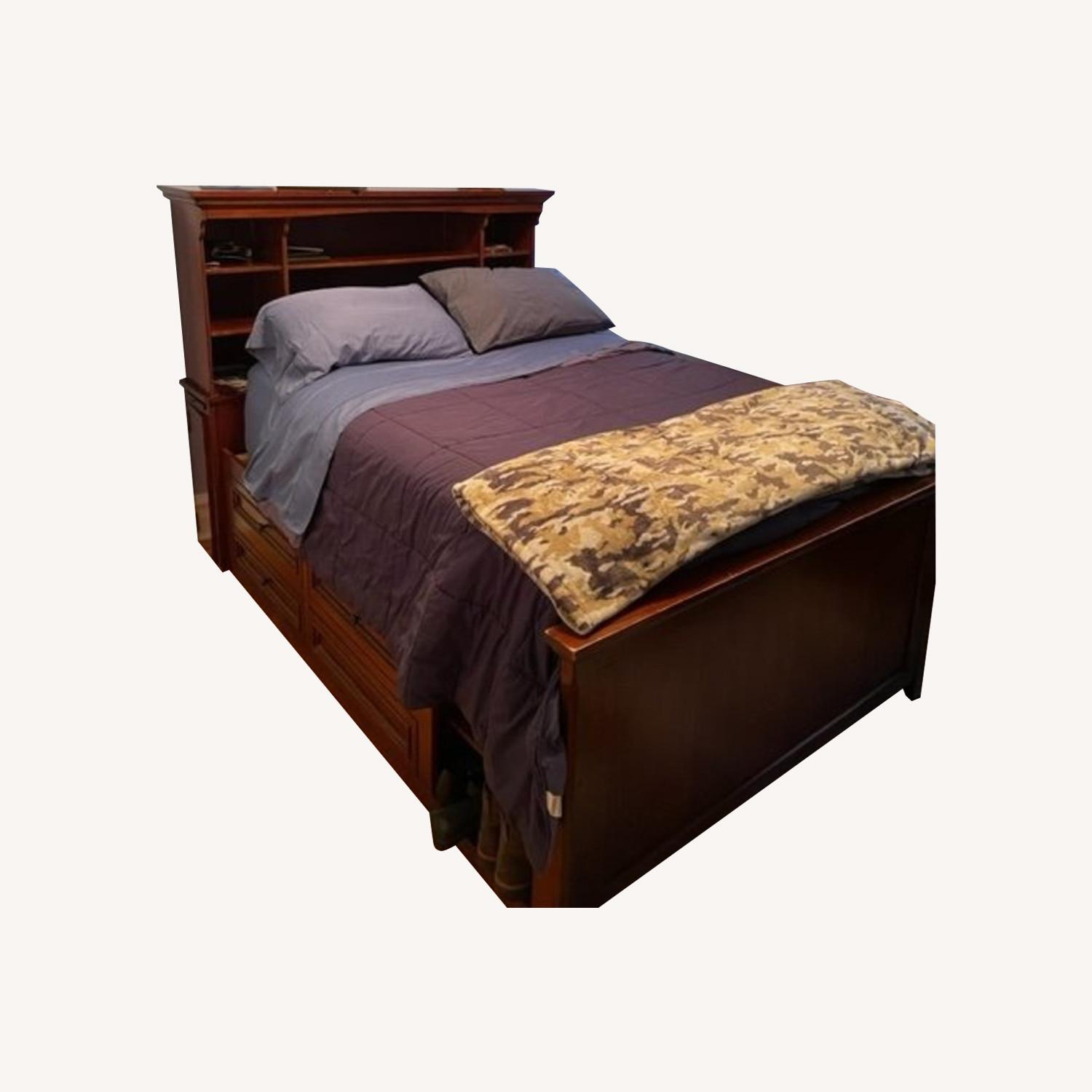 Seller's Notes:Purchased in 1999, this full-size wood bed frame is in great condition. It features 4 interior drawers & 10 shelves for additional storage. The vintage bed frame embodies a previous generation of craftsmanship & manufacturing — sturdy, well-made, elegant.