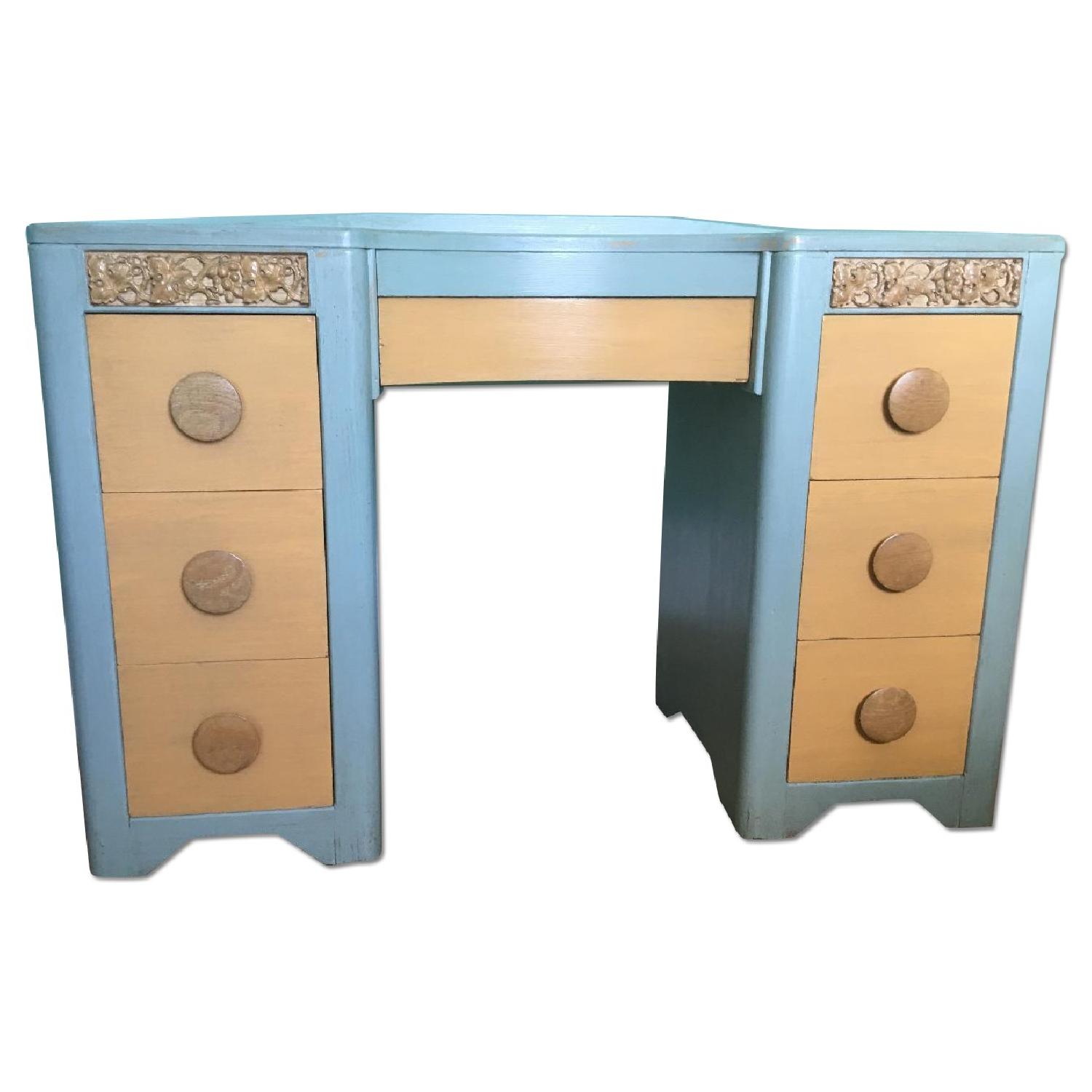 Seller's Notes:Beautiful antique desk painted light blue with inlaid floral designs. It has seven drawers and is in excellent condition. I'm selling it because I don't need it as a desk anymore.