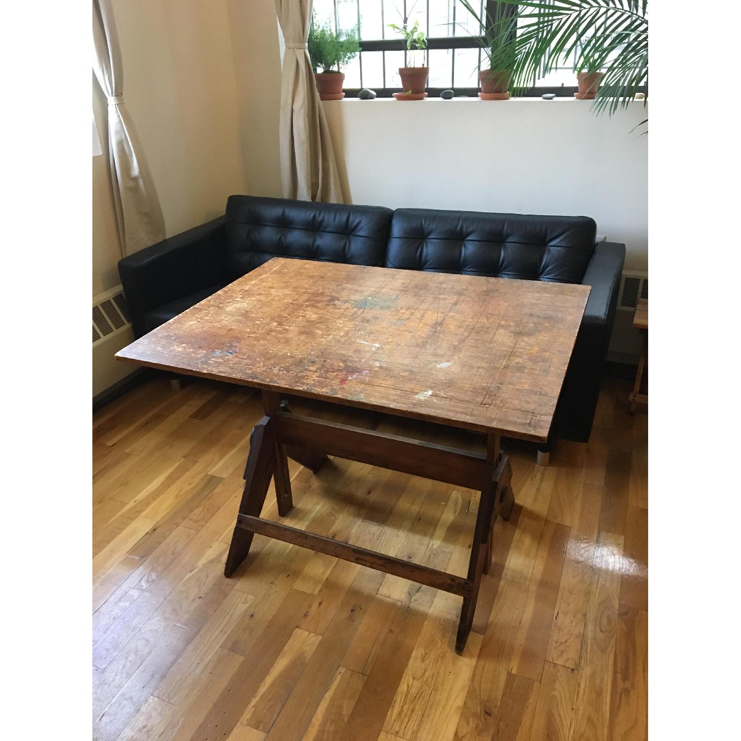 Seller's Notes:This stunning antique architect's drafting table features solid wood construction and classic cast-iron details. The table is fully functional—the table top is adjustable both for height and for tilt—and very sturdy. The table top is well-worn—scratches and paint splotches provide charming character. Ready for use in the kitchen, hallway, or studio. We have enjoyed many wonderful dinners and conversations around this table—we're selling to make room in our new apartment. It will be greatly missed!