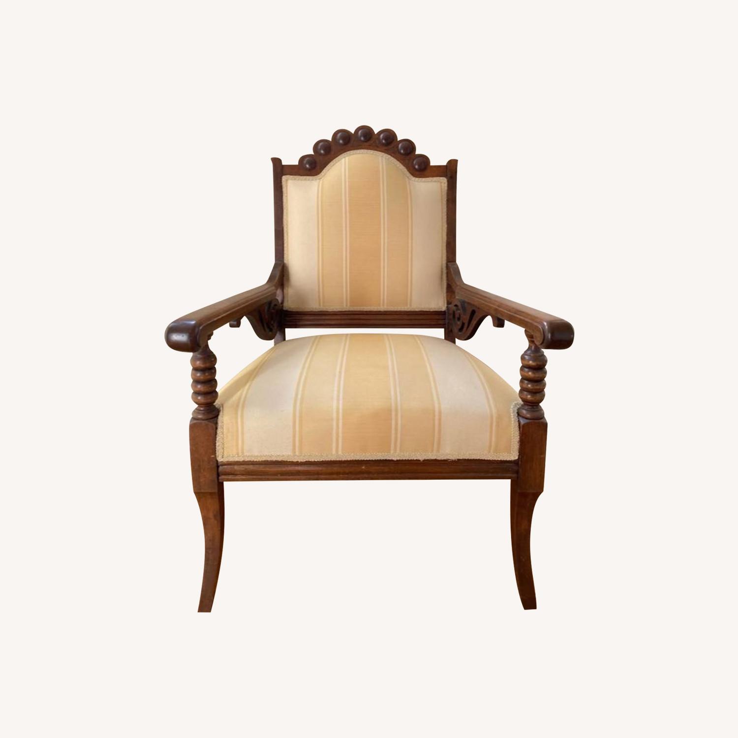 Seller's Notes:Uncommon style Victorian club chair with graceful lines. Solid wood with beautiful vintage patina. Freshly re-upholstered in neutral tones that would work with any decor.