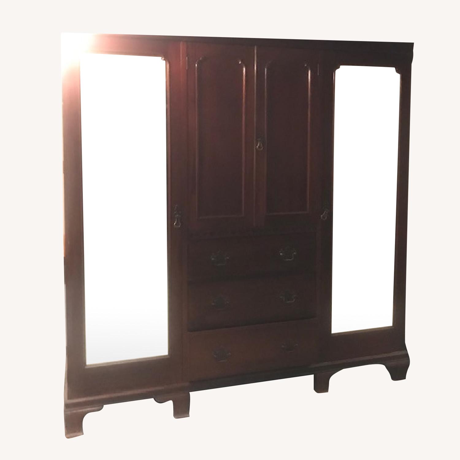 Seller's Notes:Good condition antique wood armoire with mirrors, side cabinets have hanging bar, center has 3 drawers and open shelving.