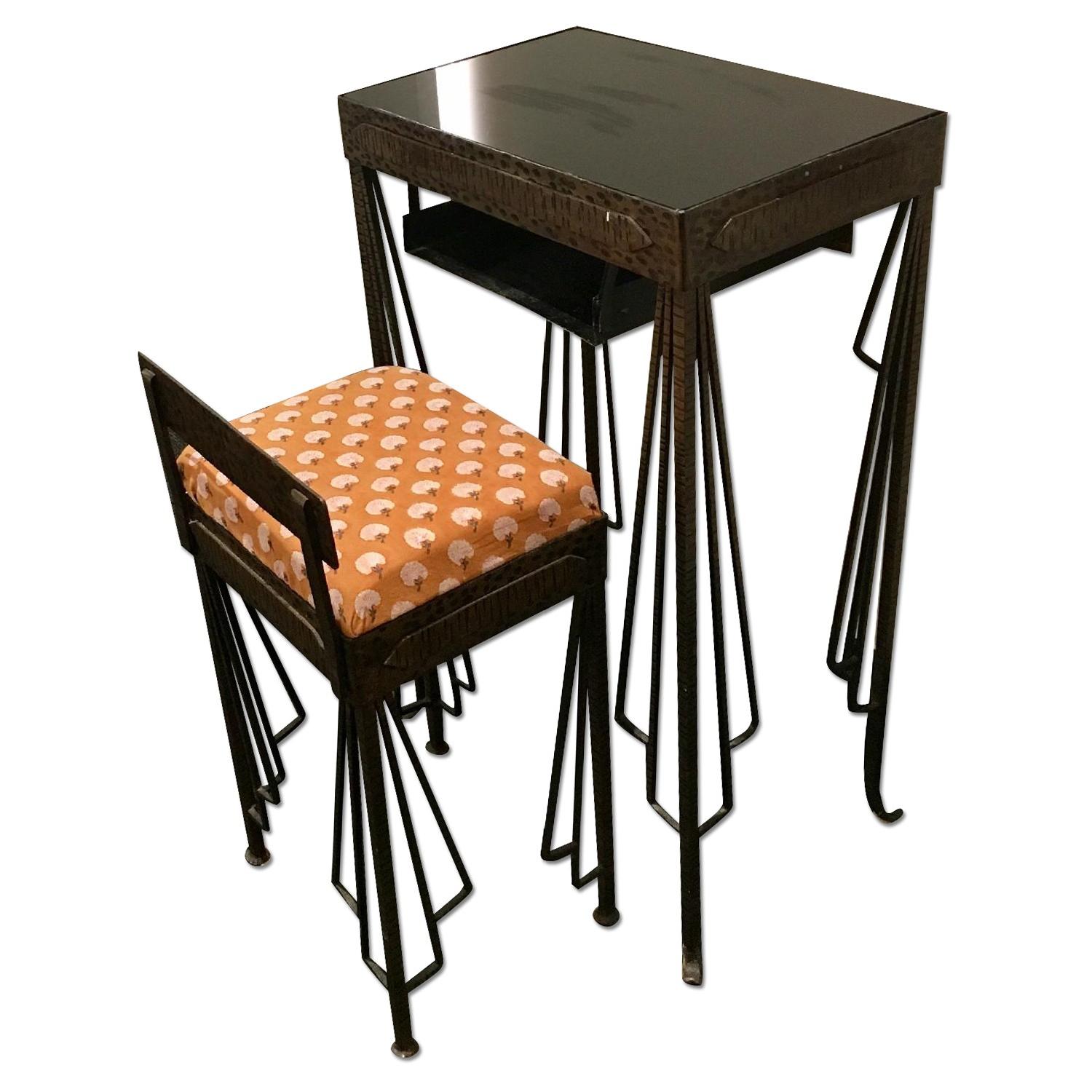 Seller's Notes:Antique Art Deco Telephone Table and Matching Stool in ocelot print metal and black painted glass. Has shelf for papers. Could also be used as small writing table or tiny vanity. Beautiful, funky metal frame with animal pattern. Sweet item for period decor or modern home.