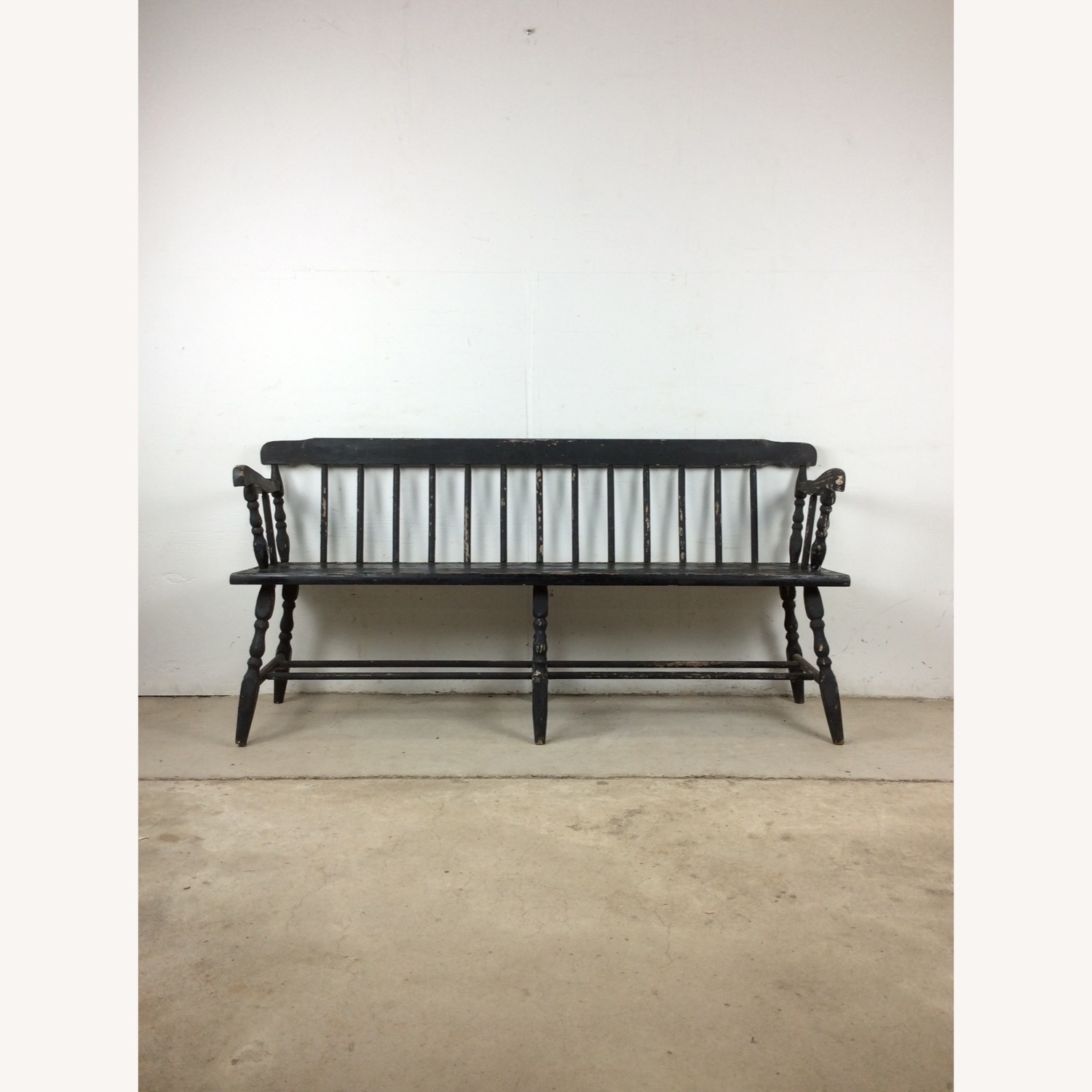 Seller's Notes:This antique Deacon's bench features hardwood construction, chippy black painted finish, sculpted arms, and stretcher base. Dimensions: 60w 18d 30h 17sh Condition notes: This antique deacon's bench features chippy black paint. It seems that a previous owner may have stored this item outside or in a screened porch because the wood seems dry and worn. The frame itself has a slight wobble. Joints have been tightened on the arms and back to prolong life. It can make an excellent occasional piece as is or is a good candidate for restoration. 6.5/10