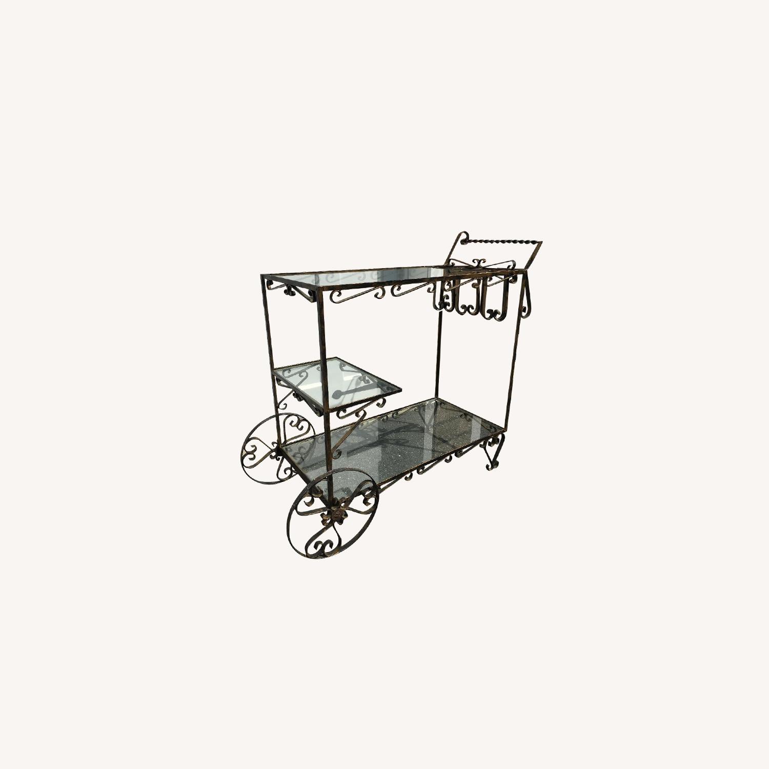 Seller's Notes:Charming bar cart with brass details and glass shelving. 3 wine bottle holders near the handle, with plenty of shelving for your wet or dry bar goods. Light scratching on the surface.