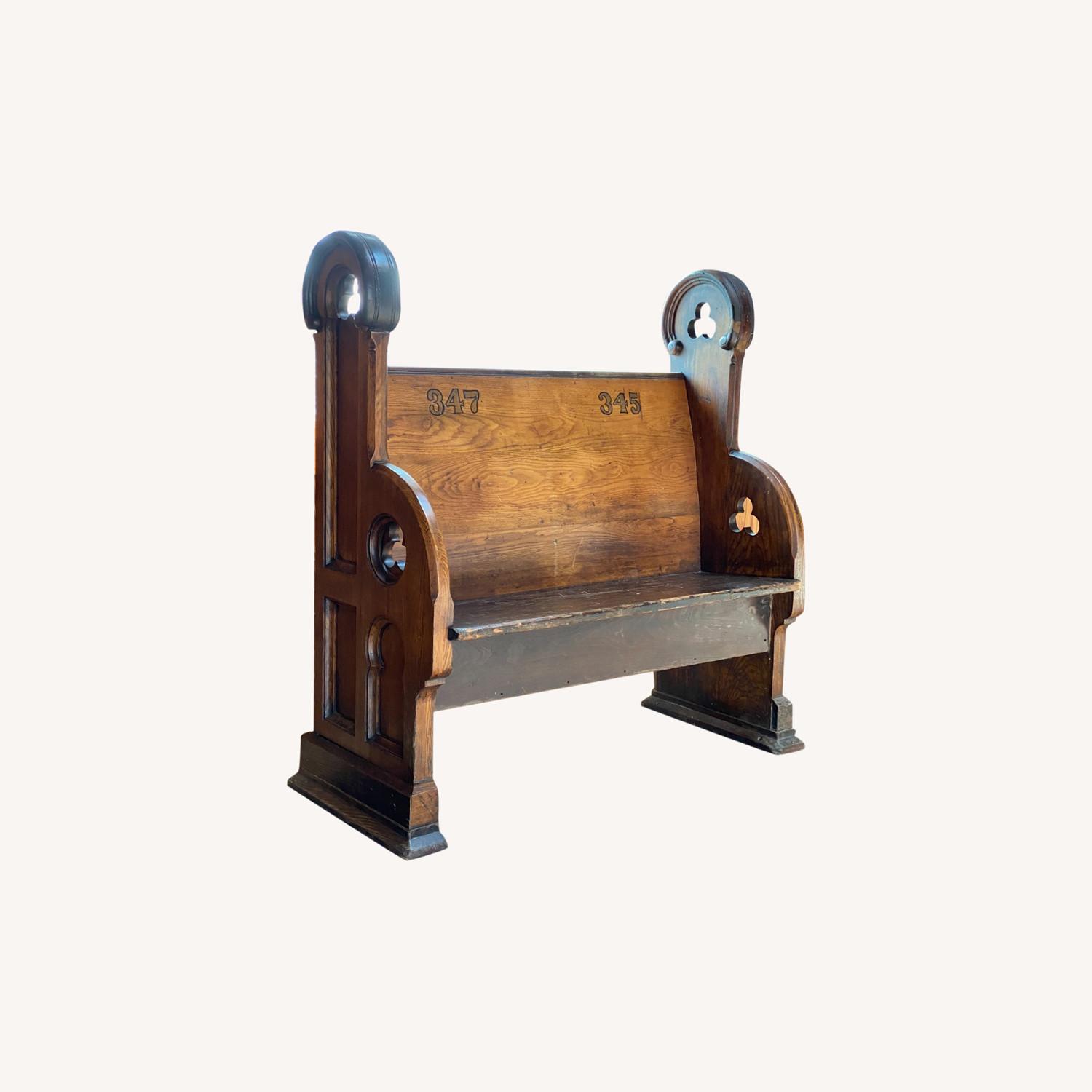 Seller's Notes:Unique antique bench from a Brooklyn Synagogue. Original bench numbers 347 & 345 are clearly visible Has 4 clover cut outs, and a lovely dark patina. Very sturdy piece. Great for an entryway