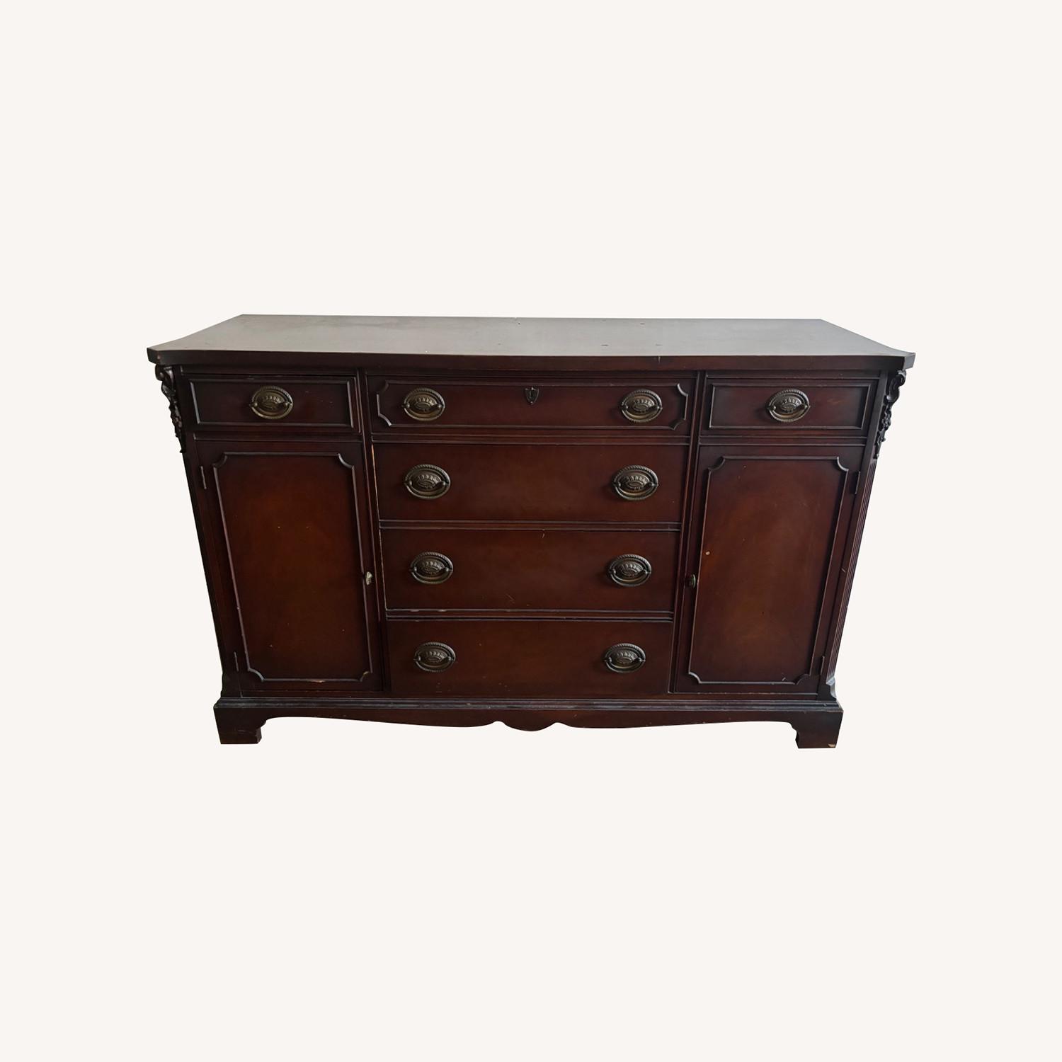 Seller's Notes:Solid wood antique buffet table, great for storage with both drawers and side cabinets. Nice dark brown color with gorgeous detailing. Marks consistent with age, as shown in photos.