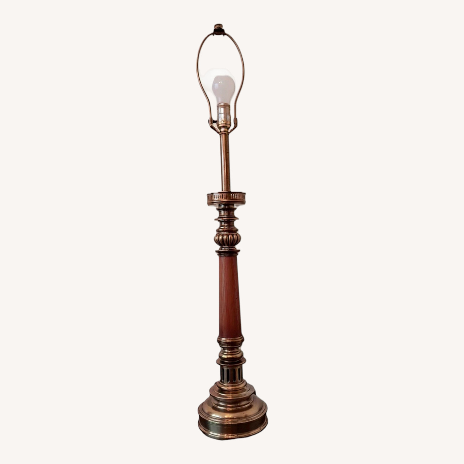 Seller's Notes:This is a family estate item. This is a unique brass and wood table lamp. It is mid-20th century and belonged to my grandparents. Based on AI characteristics "this is a vintage Stiffel brass and wood table lamp." Since I cannot find the brand written on this lamp, I can neither confirm nor deny that it is a Stiffel. It is unique in that, as of yet, I cannot find one just like it, but it does look like many of the Stiffel style lamps available. There is no shade available for this lamp and the light bulb is not included. The brass shows some patina. The wood has some scratches but they do not take away from it's natural beauty. It is fairly heavy. It is tall at 38 inches with a base diameter of 7 inches. It is level and does not wobble. Although the 3-way light switch works, and it will give you a lighted bulb, I personally recommend, especially if using it for everyday lighting needs, rewiring this antique lamp as the plug is not safety rated for today's standards and the cord is dry.