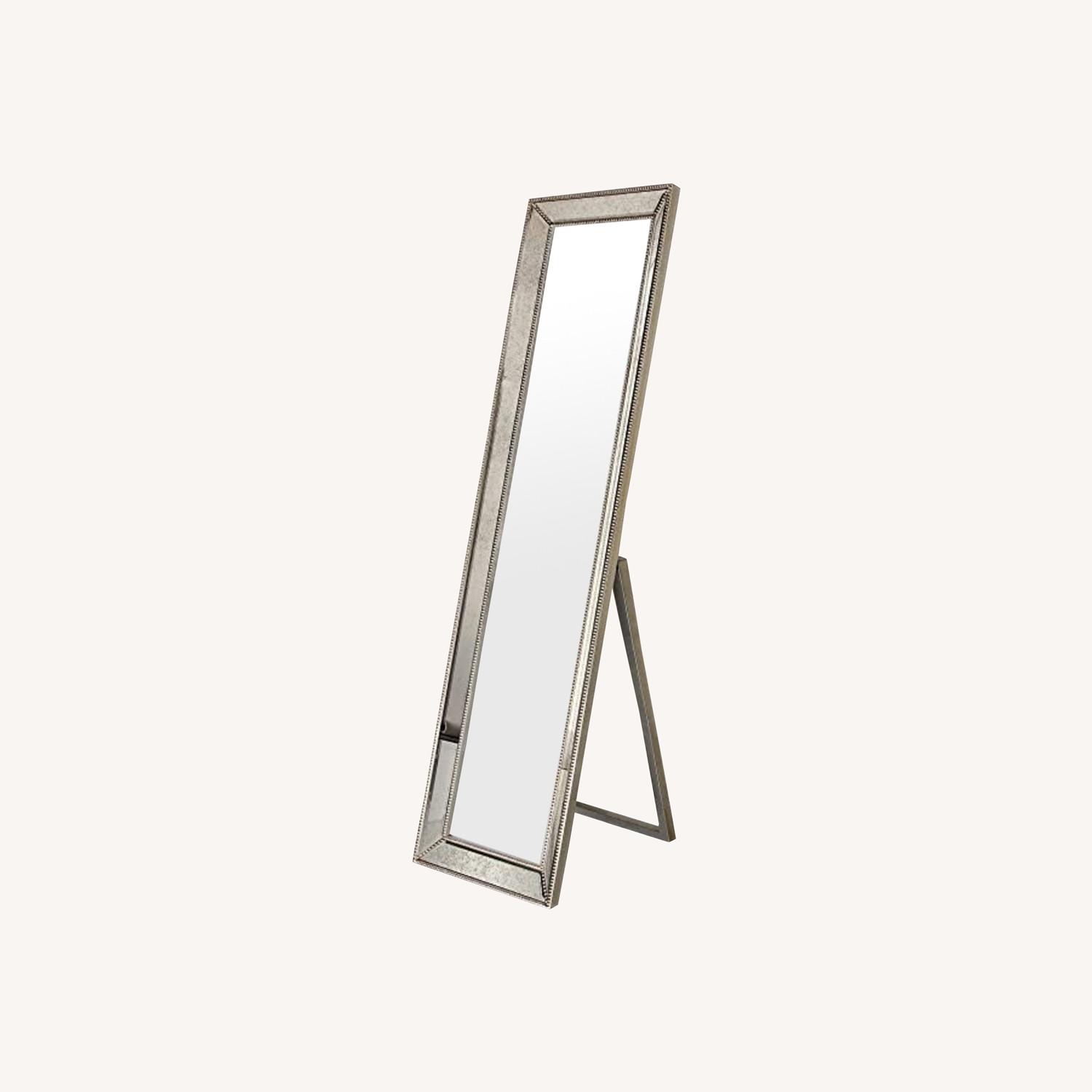 Seller's Notes:Antique Cheval Solid Wood Frame, 1"-Beveled Center Floor & Full Length Mirror, Ready to Stand on The Floor, 18" x 64", Champagne UNIQUE MIRROR-This very tall leaner mirror will stand proud in any room, supported by a dependable wooden frame. The mirror is raised slightly from its surrounds by a 1-inch bevel that helps the mirror to project a presence into the room, while also providing a space for adornment. The mirror has a silver pattern with bronze beads that recalls a royal style. 64"L x 18"W ~30 pounds