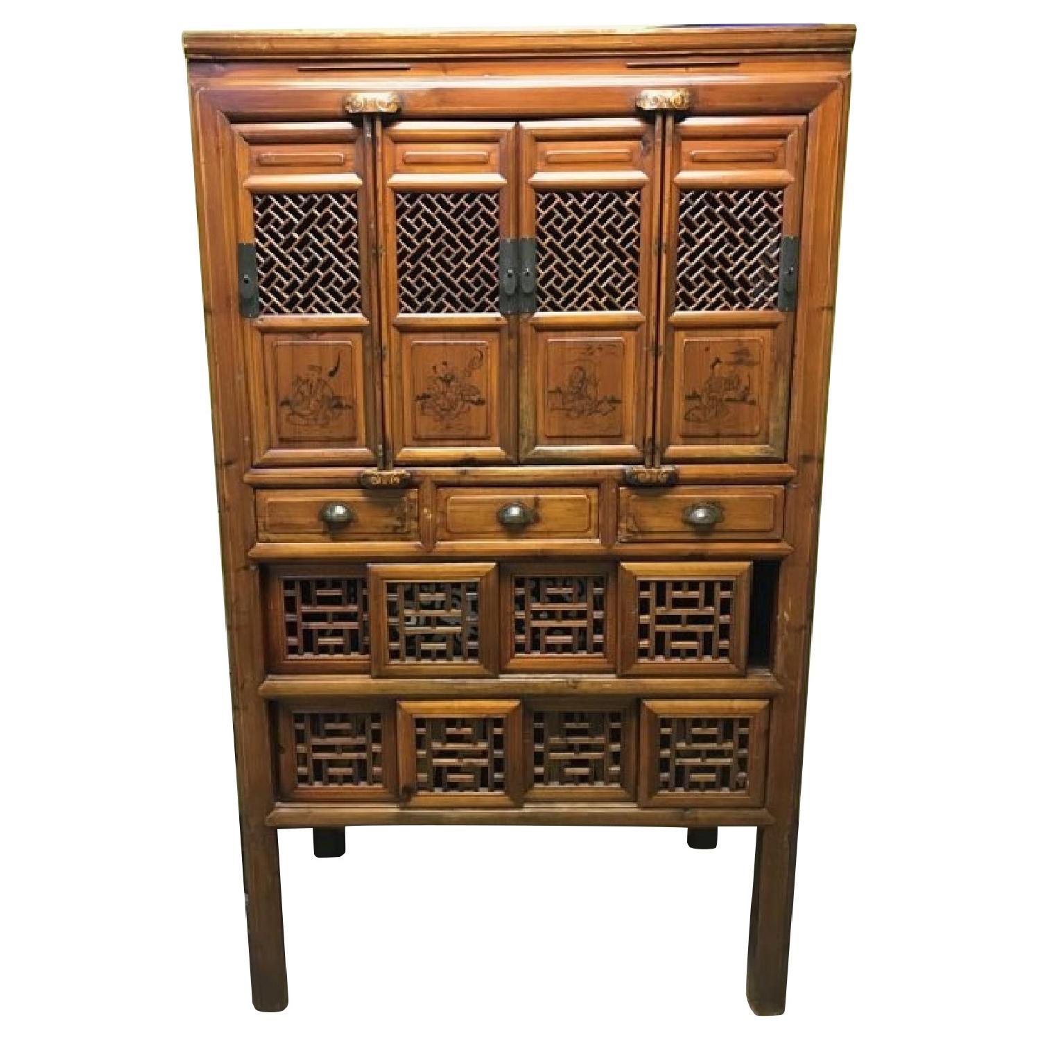 Seller's Notes:Authentic Chinese medicine drawers and cabinet. Handmade in the traditional style and brought over from China to the US. Pristine condition. This antique was made from the pieces of an even older antique from China and represents a great deal of history. Because of its unique nature, both in craftsmanship and style, it is impossible to find another piece like it.