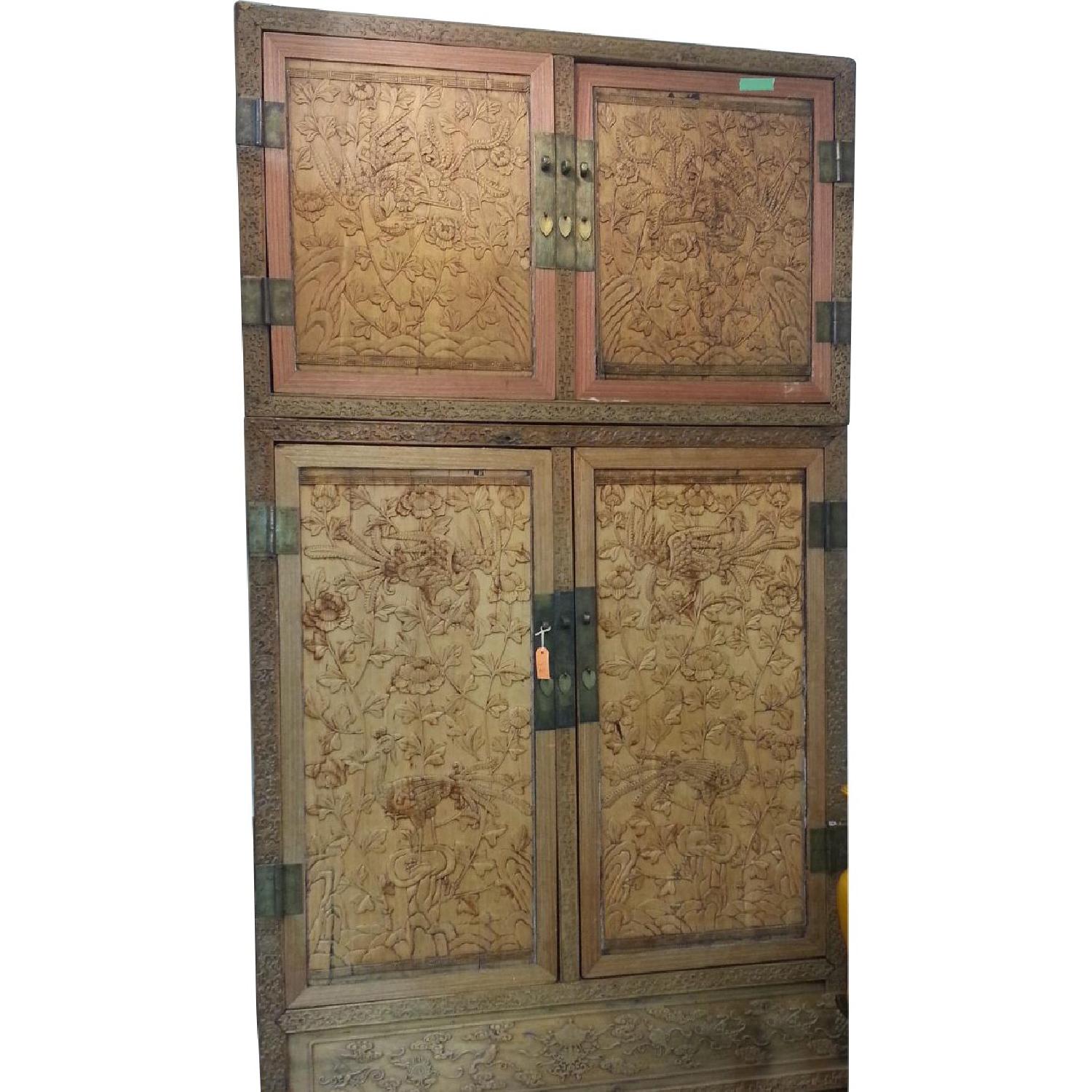 Seller's Notes:A pair of beautiful antique Chinese cabinets, attractive both stacked and as separate pieces. Each is carved with elaborate phoenix scenes on the front, and closes with the original antique incised brass lockplates and hinges. I bought them in an estate sale, but unfortunately need to sell them before moving. There is a repair to the right front leg, some separating between panels, and the pieces need a couple interior horizontal shelves (just planks) re-introduced. Smaller cabinet: 33" H X 55" W X 23.5" D. Taller cabinet: 74.75" H X 55" W X 23.5" D.