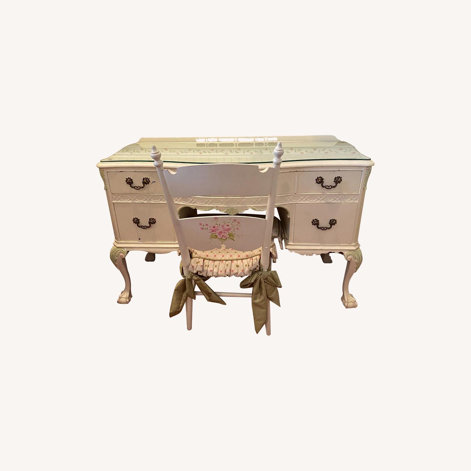 Seller's Notes:Antique White Desk and Chair. Comes with custom glass top. One large top drawer and two side drawers. Paint is scratched in some areas . Chair comes with custom cushion.