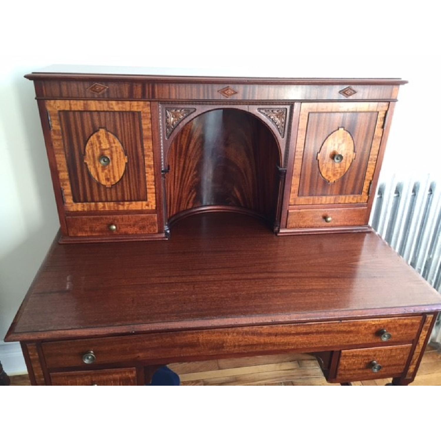 Seller's Notes:Mahagony antique ladies desk with beautiful carved details- one piece, all drawers open, great condition. Small Compartments for mail and other items. Two tone matches any eclectic decor- classic antiques, retro, I mixed it with contemporary in uws brownstone.