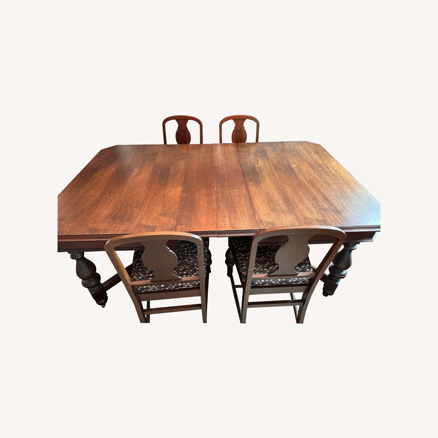 Seller's Notes:Previous owner inherited the set from their grandparents who had it at their vacation home. It is at least 100 years old. Table has some wear and tear with visible scratches that can be covered. Upholstery on chairs has some pulls.