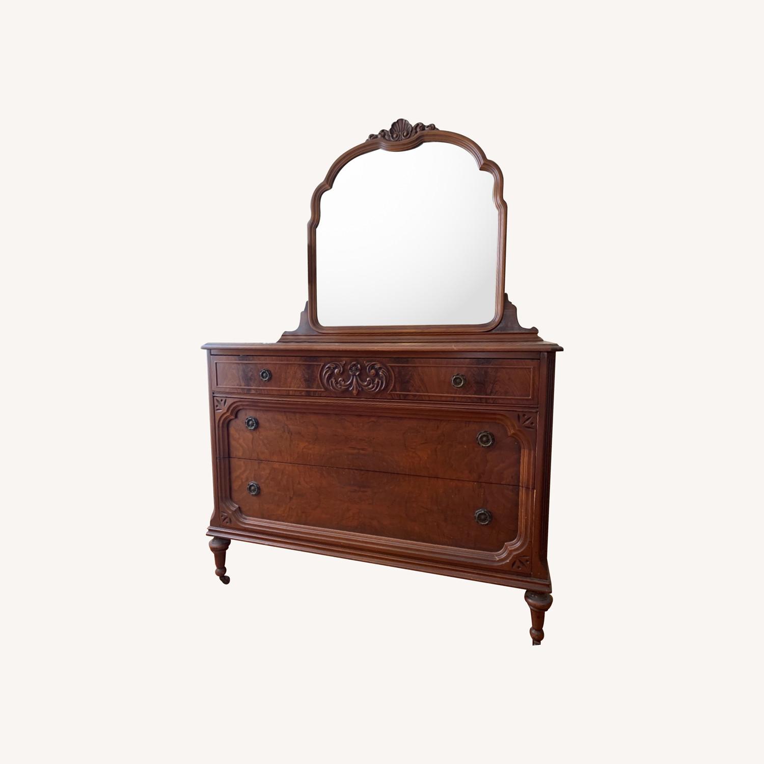 Seller's Notes:Beautiful solid furniture. solid oak draws. brass pulls. Book matched veneer Stump Walnut, casters, shell motif tops the mirror. American made to last generations. Purchased in 1934 by my grandparents. The mirror screws off.