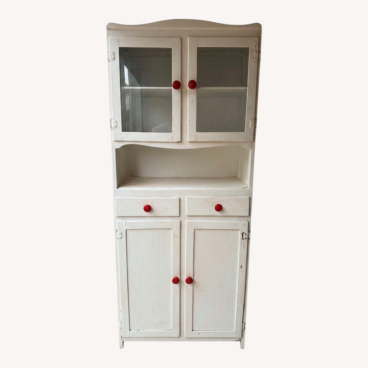 Seller's Notes:We purchased this adorable vintage cupboard years ago for the kitchen in our first home. It served us well, but it’s ready for a new home! The wood is cracked on one door, causing the hinge not to work, and the glass is cracked on one pane.