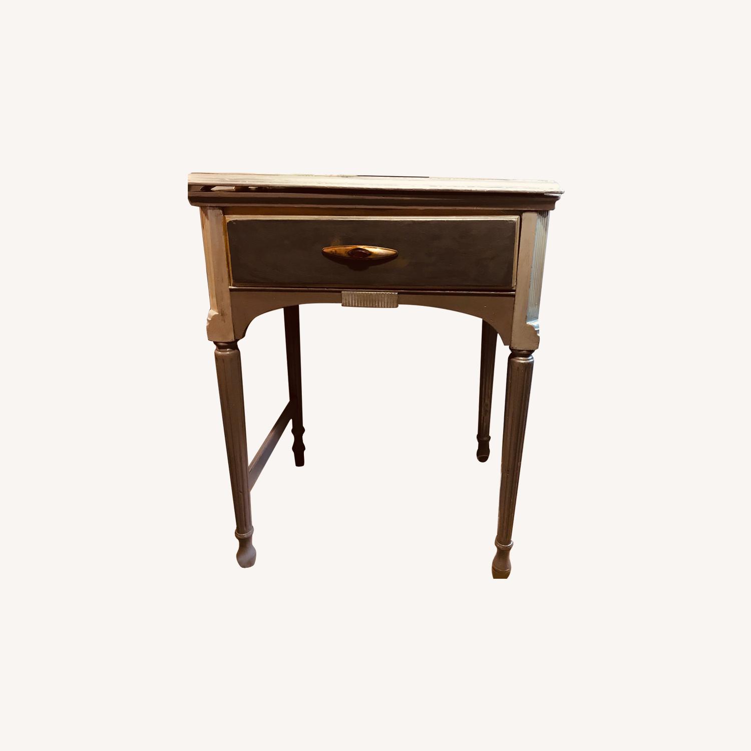 Seller's Notes:Antique fold out sewing table/end table This is a beautiful and classic piece. Antique sewing table. Falls out with full-size leave. The leaf is supported by sturdy brass hardware. Stable for use. Also include a pull out drawer with three separate compartments. The original wiring and electric outlet are in place, For those hoping to install a sewing machine. It’s painted in grays light blues and metallic silver’s. Has a wonderful distressed sleek look. Hardware is copper with Ruby bakelite. Simply stunning. There has been some minor damage to a couple of the legs. But they’ve been repaired.