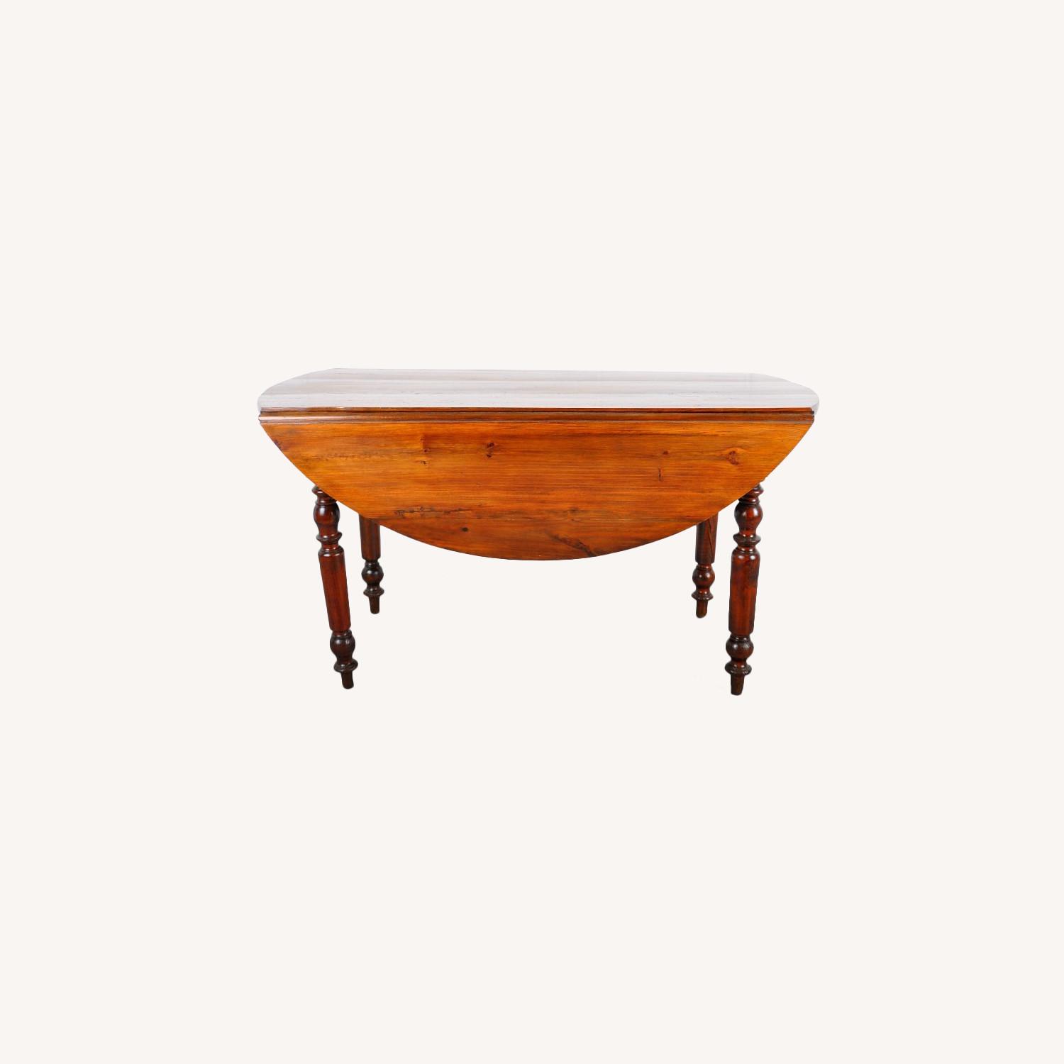 Seller's Notes:French country style dining table made of solid pine wood. The table has a solid construction, hand-carved legs, and two drop leaves that give the table an oval shape when open. Circa 1900s - Origin: France - Dimensions: W 53.5" x D 25" x H 28.5"- When the leaves are open the depth measures 49" / apron clearance 24"