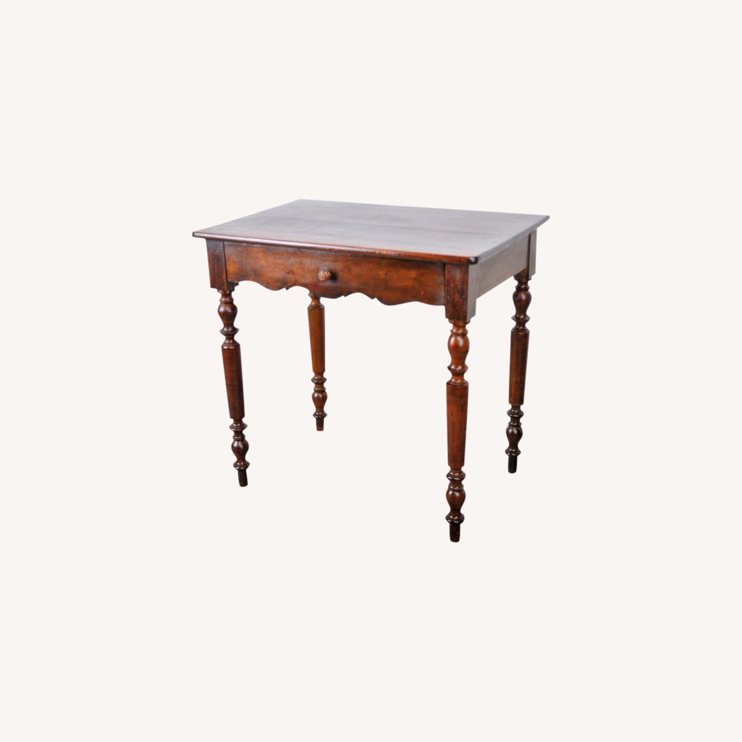 Seller's Notes:Petite French country style writing desk made of solid walnut wood. The desk features solid construction, hand-carved legs and, and a spacious center drawer. - Origin: France - Dimensions: W 29.5" x D 19.25" x H 28" - clearance 23"