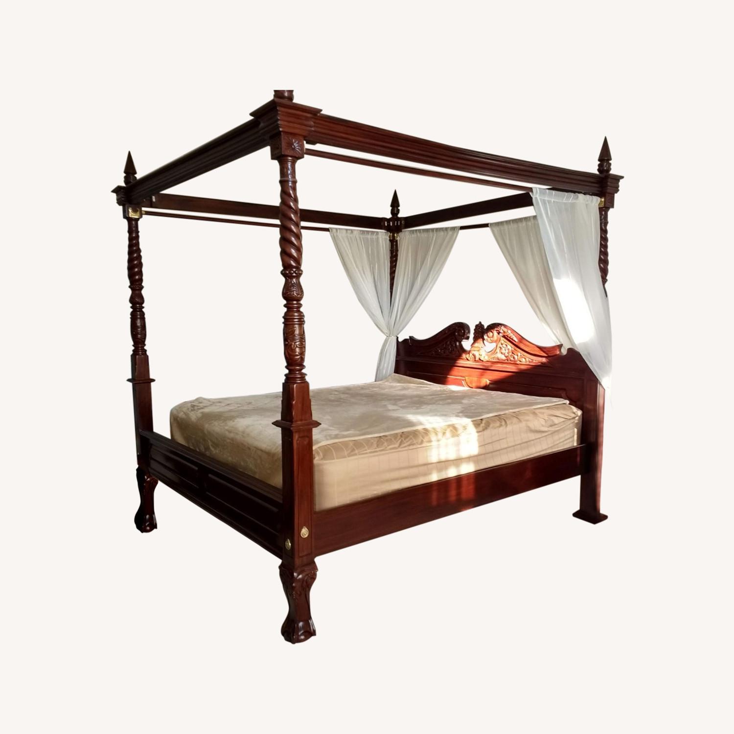 Seller's Notes:King sized, hand-carved on the headboard and pillars with intricate details. Bench is included Only a little crooked on one of the poles No scratches or discolor, look likes new A set of matching nightstands and a dresser with mirror are posted separately.