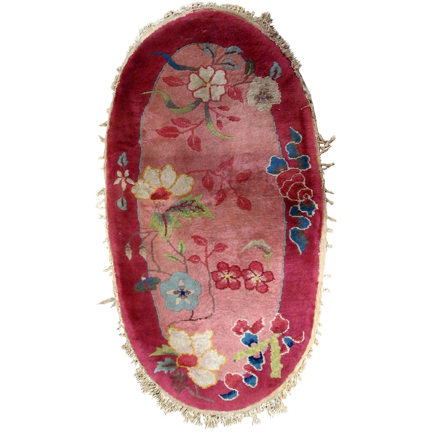 Seller's Notes:Oval Art Deco Chinese rug in original good condition. the rug is made in wool, quite thick and soft. -condition: original good, -circa: 1920s, -size: 2' x 4' ( 60cm x 121cm ), -material: wool, -country of origin: China, -style: Art Deco, -background colours: crimson, fuchsia, blue, green, beige, yellow.