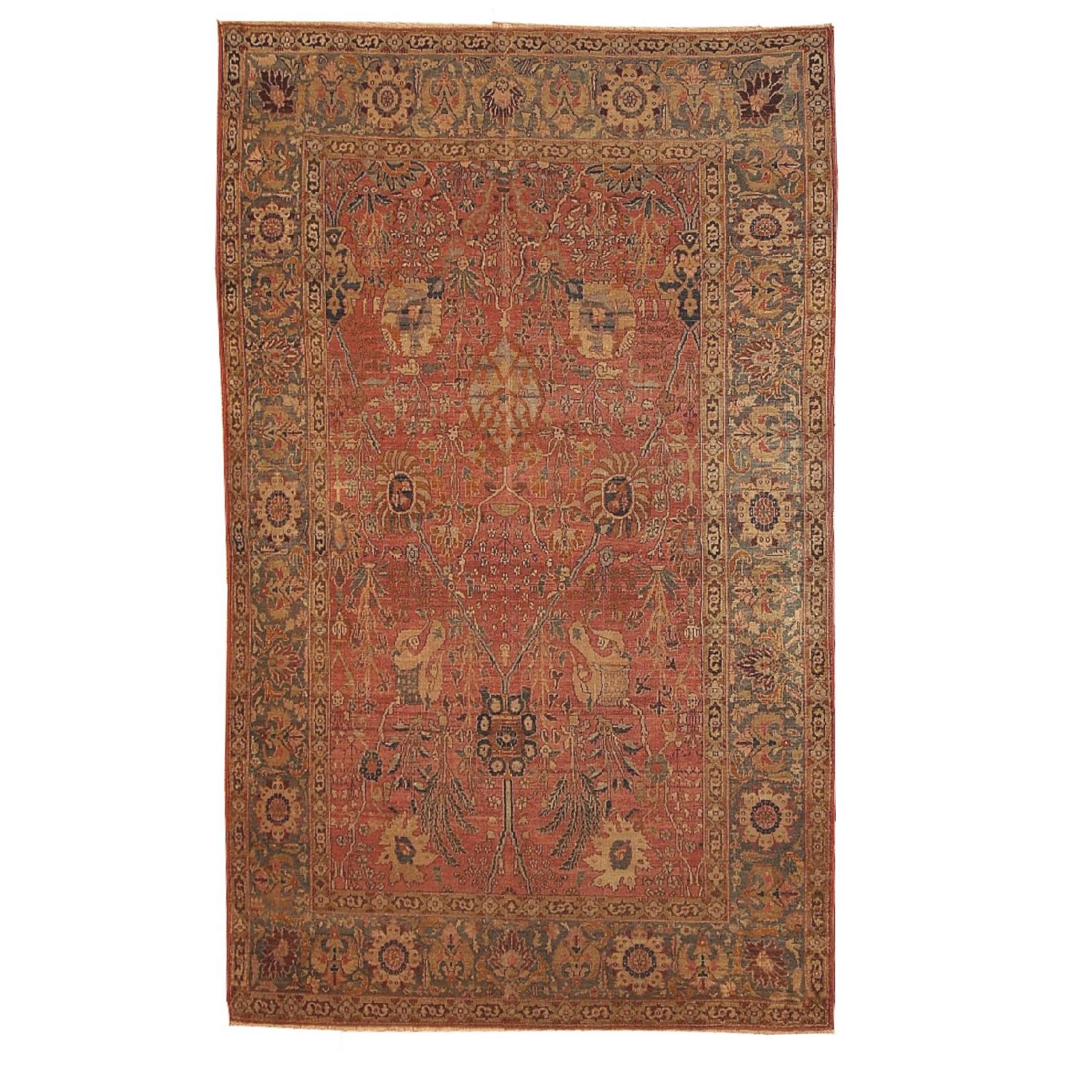 Seller's Notes:Fine weaved Indian Loristan rug in peach and coral colours. Garden design all over the rug with greyish-blue details. It is in original good condition. -condition: original good, -circa: 1880s, -size: 5.8' x 8.8' ( 176cm x 268cm ), -material: wool, -country of origin: India, -style: Loristan, -background colors: peach, coral, olive green, beige