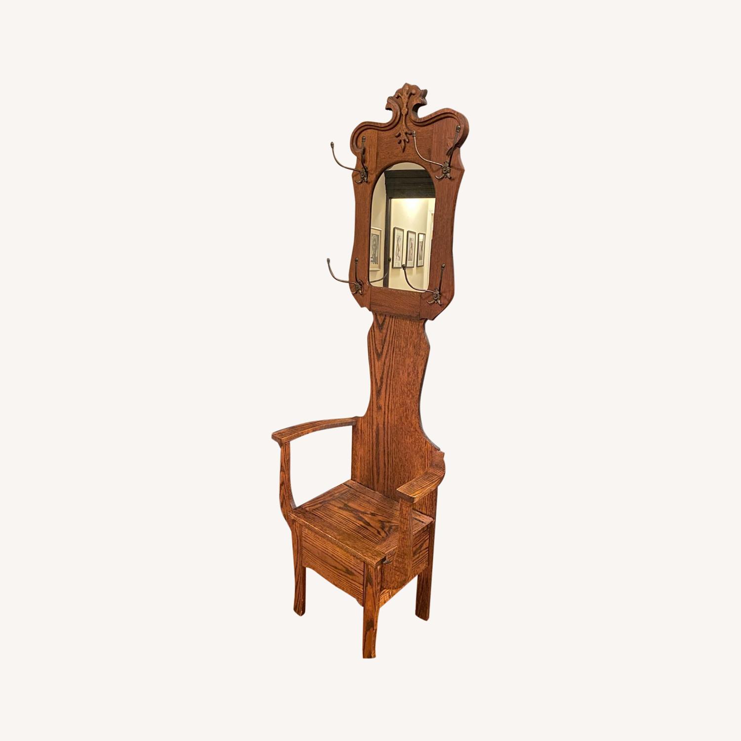 Seller's Notes:This is a unique chair with storage that has a mirror and a hat rack. Perfect for a NYC apartment for extra storage and for a place for bags and hats, as well as a quick self glance before heading out into the city. In excellent condition.