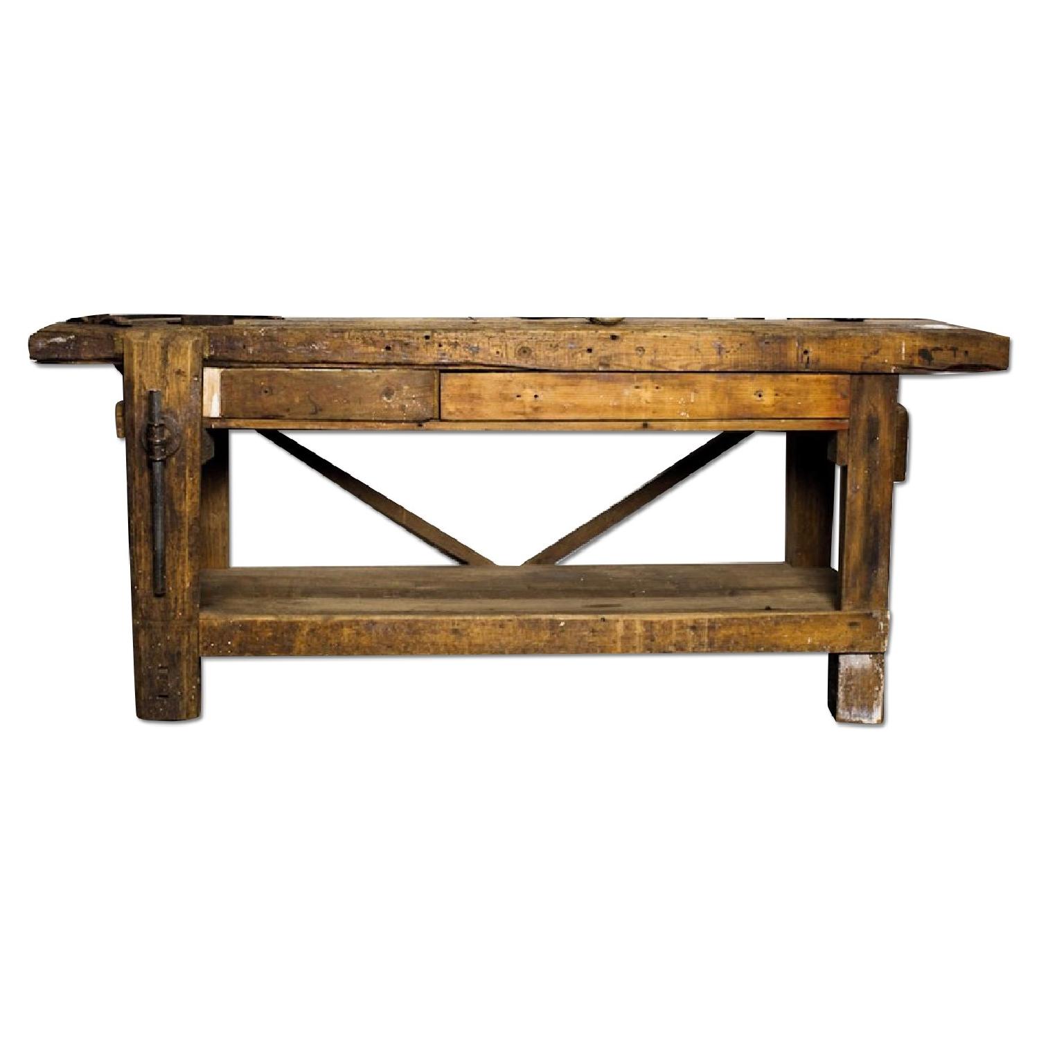 Seller's Notes:Amazing huge antique industrial table, great for storage, display, or any number of uses such as holding a TV, using it as a buffet, or even as a kitchen island This table comes from a gun factory dating back between 1880s-1910s. The wood is just beautiful and has had some minor restoration work done. There are 2 drawers in the front with handles as well as a shelf on the bottom, making it well suited for display and storage. There is also a decorative metal rod (unknown use) on the left side in the picture