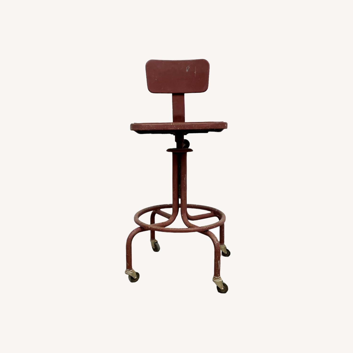 Seller's Notes:• This Royal Industries Drafting Stool is the perfect addition to any workspace. The industrial design gives any room a touch of vintage charm. • Made entirely of metal, this stool swivels and rolls. Very industrial finish to complement your garage or office, or wherever your workspace might be. • This vintage industrial stool is adjustable, so you can always find the perfect height for your needs. The antique office chair is also very sturdy, so you can rest assured that it will last for years to come. Measurements: Seat Height: 27" Seat Width: 14" Seat Depth: 15" Total Height: 19" Space btw wheels: 15" Disclaimer: Product color may slightly vary due to photographic lighting sources or your monitor settings.
