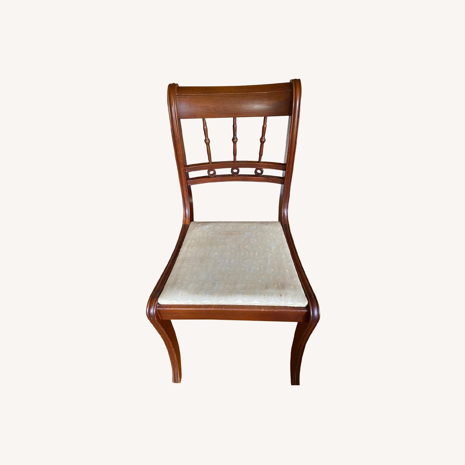 Seller's Notes:Lovely wood chairs needing a nice recover of seat. Did many changes over the years. Very easy to recover. Lots of lie left in these beauties.